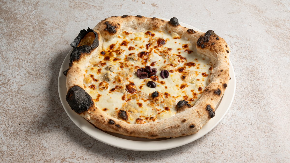 מוצרלה, גורגונוזלה (גבינה כחולה), גאודה, פקורינו וקומץ זיתי קלמטה. שימו 💙 מומלץ לחמם את הפיצות למשך 2 דקות בתנור שחומם מראש לחום מקסימלי