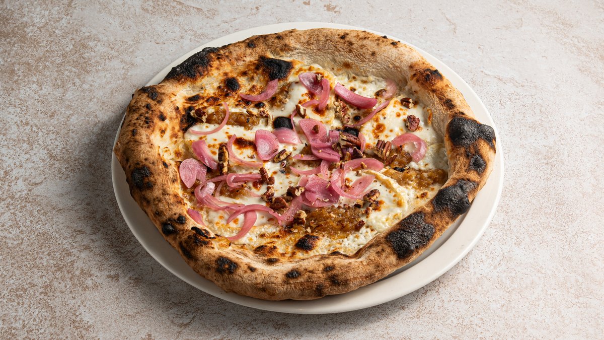 קרם פרש, בצל מקורמל, גבינת ברי, בצל מוחמץ ופקאן. פיצה לבנה ללא רוטב עגבניות שימו 💙 מומלץ לחמם את הפיצות למשך 2 דקות בתנור שחומם מראש לחום מקסימלי