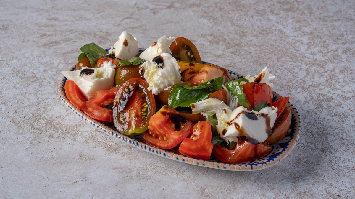 מוצרלה פרסקה, תערובת עגבניות, קרם בלסמי, בזיליקום ושמן זית קורטינה