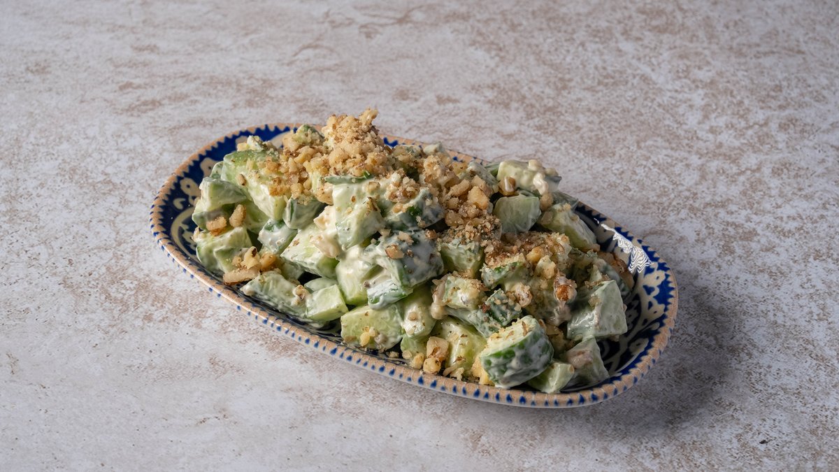 מלפפון חתוך גס, אגוז מלך טחון, רוטב איולי לימוני ופטרוזליה