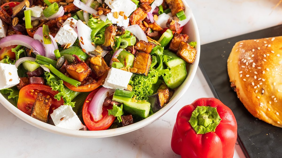 חסה לליק, מלפפון, עגבניה, בצל סגול, זיתי קלמטה, זעתר, פטה ברוטב שמן זית שום לימון