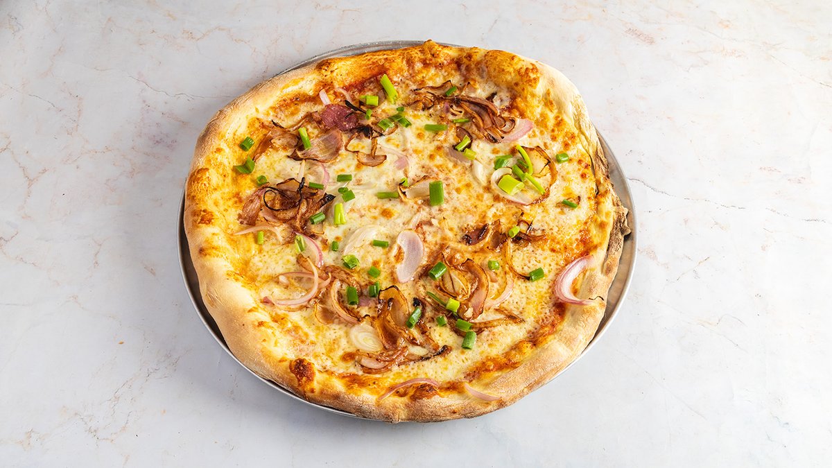 רוטב עגבניות מדלסנונ'ס, גבינת מנדלסונ'ס, בצל מטוגן ובצל רגיל