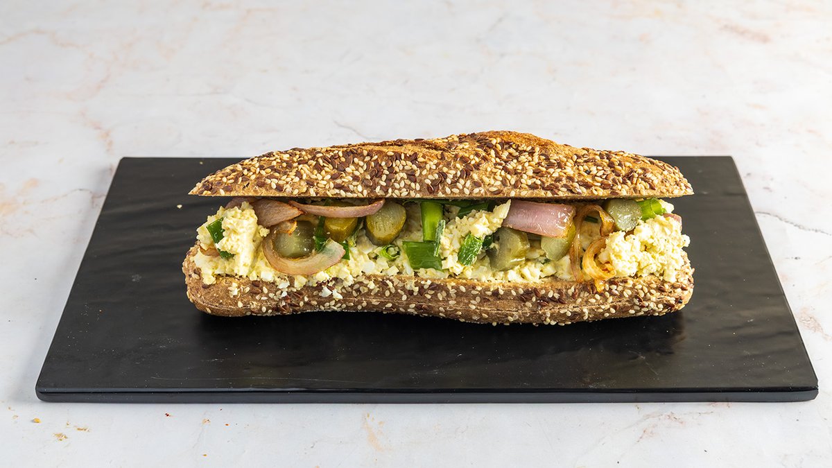 סלט ביצים, בצל מטוגן, בצל ירוק ומלפפון חמוץ