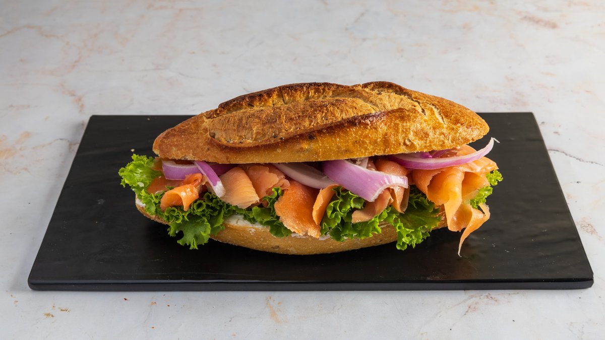 לחם מחמצת איטלקי, שמנת, סלמון מעושן ובצל סגול