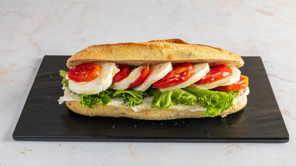 לחם מחמצת איטלקי, פסטו, מוצרלה ועגבניה