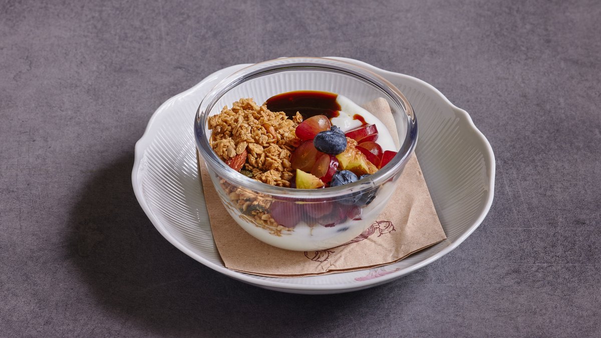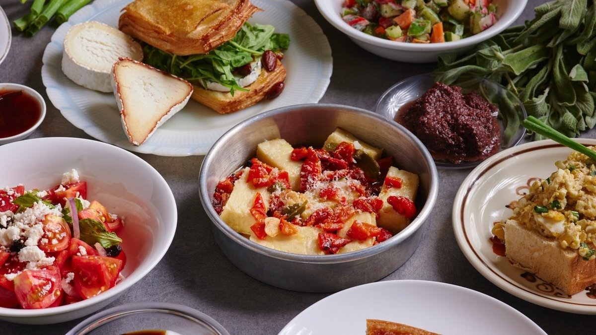 פרוסת בריוש ללא גלוטן קלויה בשמן זית ושום, עגבניות, בצל, זיתים, תרד מאודה בלימון, גבינת פארן, ביצת משק עלומה, שמן זית