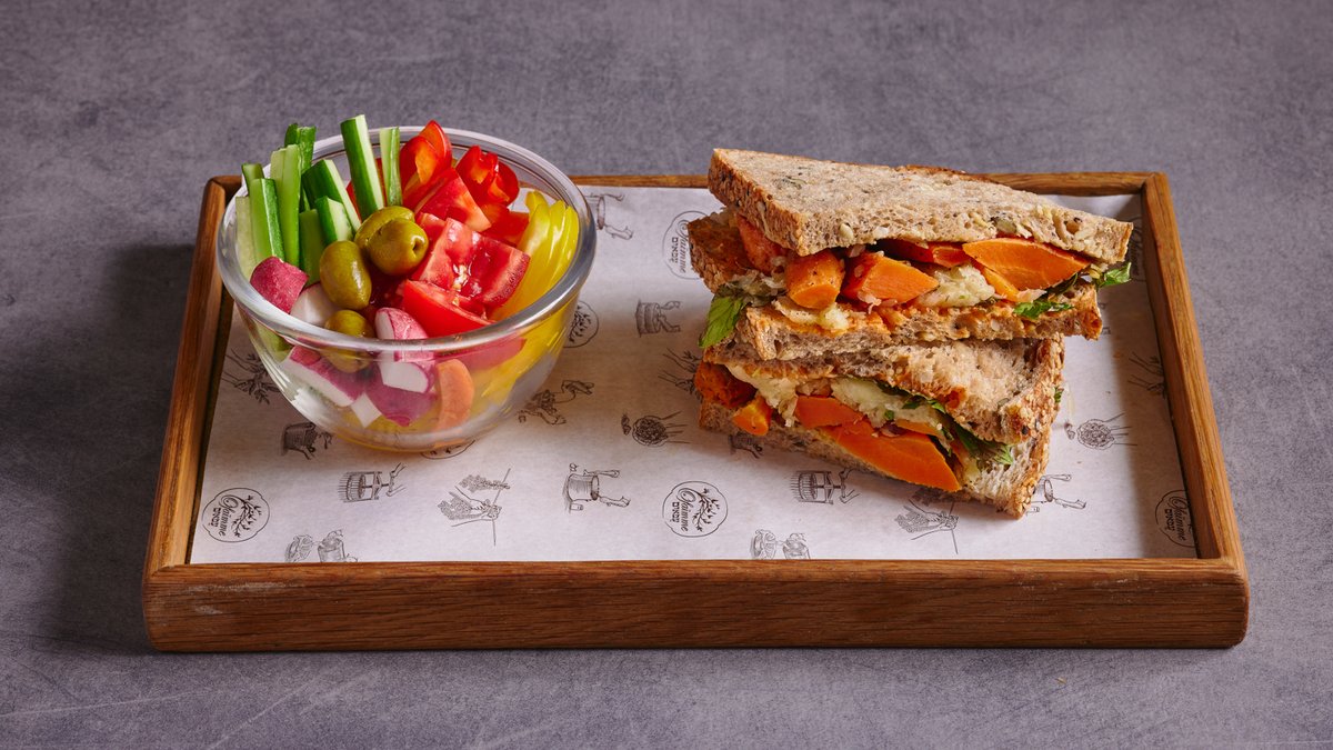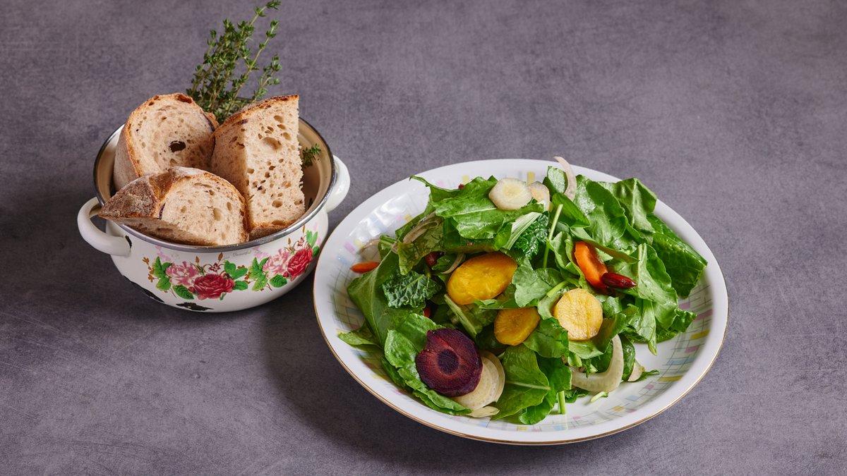 לחם שאור דגנים, גזר צלוי עם מרווה ושקדים, כרוב כבוש, לימון כבוש, פטרוזיליה, נענע, טחינה