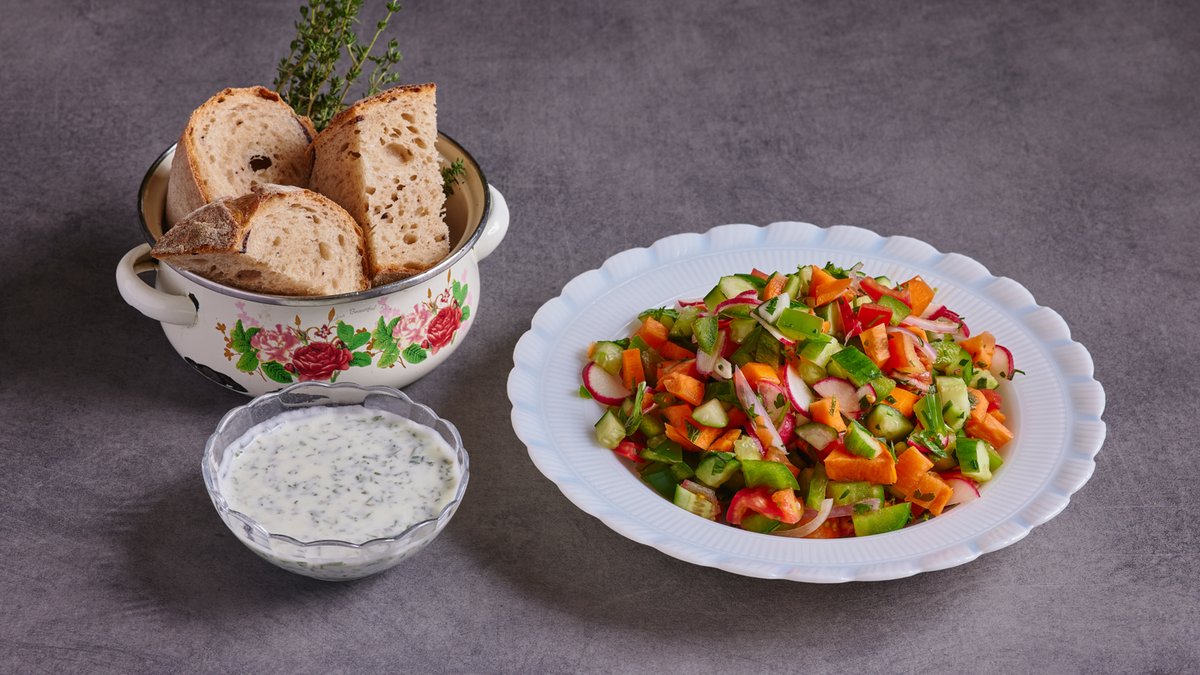 מלפפון, עגבניה, צנונית, בצל, גזר, פלפל ירוק, עשבי תיבול ווניגרט יוגורט ועשבים