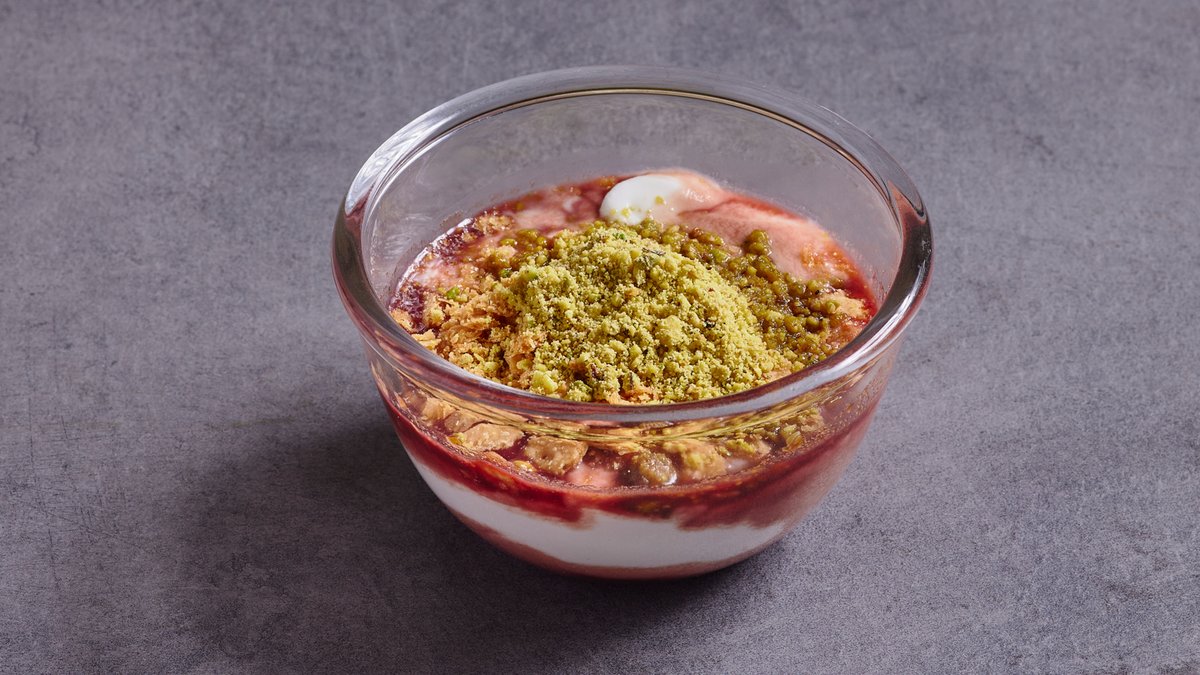 קרם צחור, סירופ רימונים, קראמבל אגוזי לוז ופיסטוקים,מי ורדים