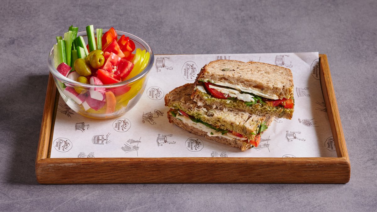 לחם שאור דגנים, חמאה, עגבניה, פסטו, פטרוזיליה, פרוסות גבינת צימאון בשלה