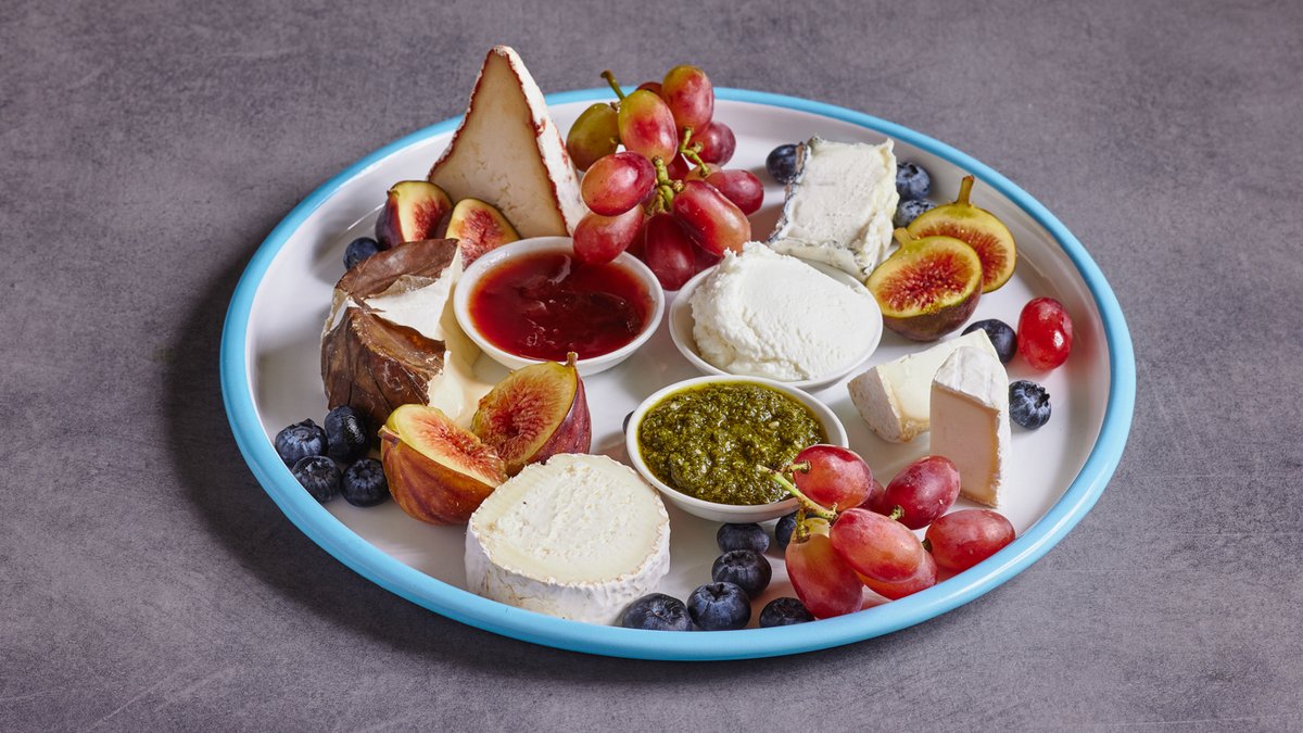 מגש גבינות המשק זוגי מחלב עזים אורגני, פירות, ממרחים, לחם מחמצת