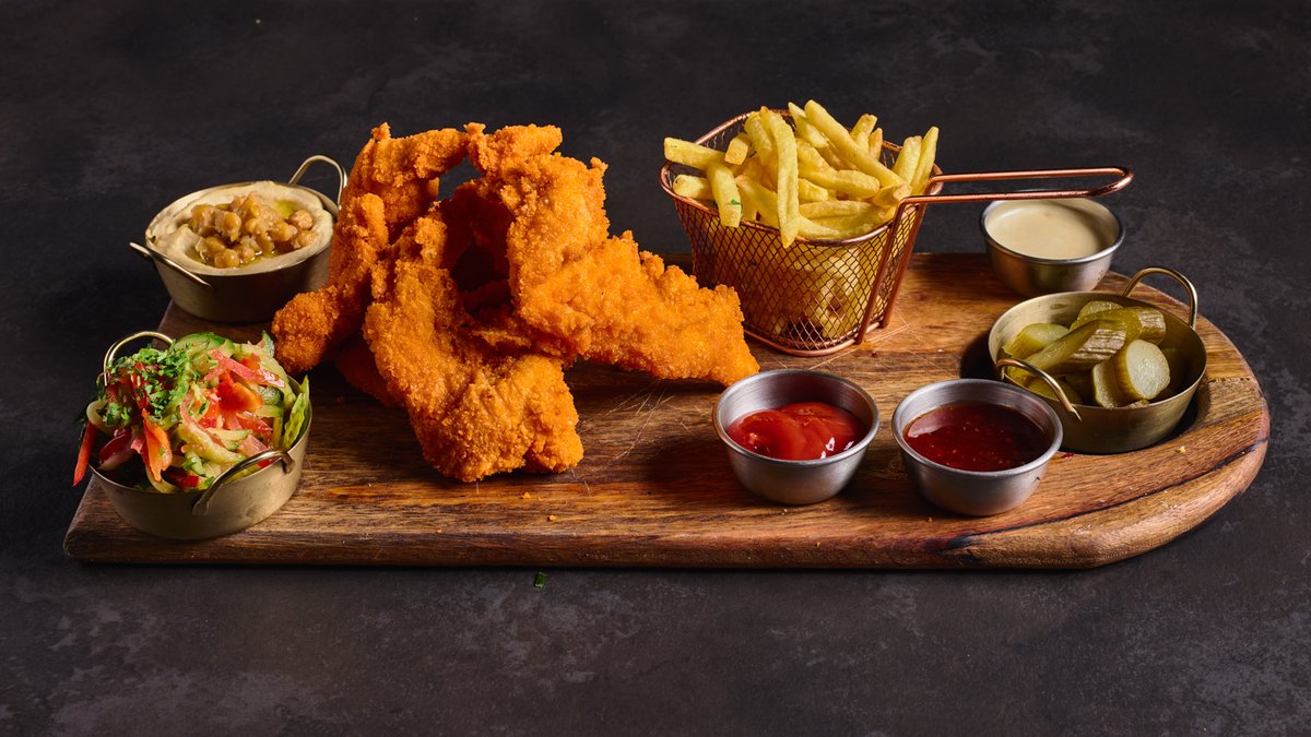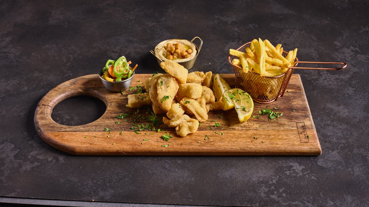 דג אמנון מטוגן וצ׳יפס, מוגש עם חמוצים וזיתים