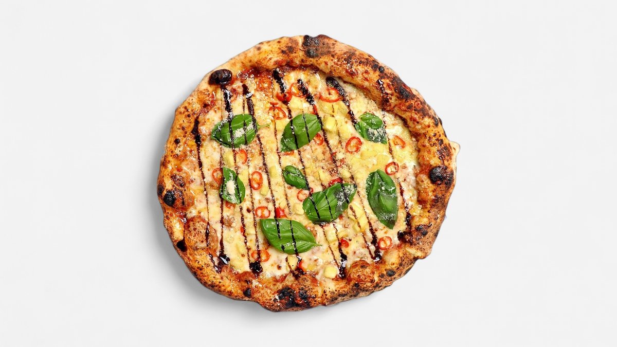 רוטב עגבניות איטלקי, מוצרלה, גאודה, אננס טרי, צ'ילי אדום, בזיליקום טרי, שמן זית, חומץ בלסמי, פרמז'ן