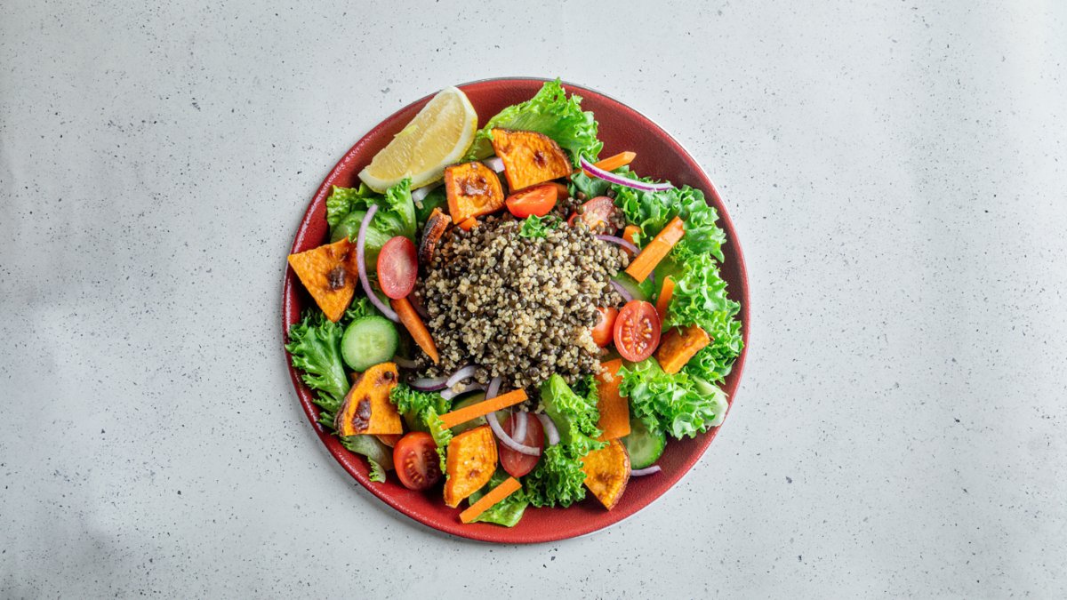 חסה, עגבניות שרי, מלפפון, גזר, פטרוזיליה, בטטה, בצל ירוק וסגול, קינואה ועדשים שחורות בשמן זית ולימון מוגש גם רוטב שום בצד