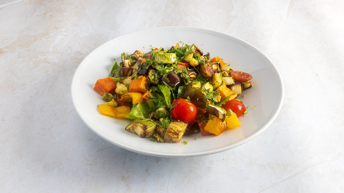 מבחר חסות צבעוני, פלפלים צבעוניים, קישוא, בטטה וחציל קלויים בתנור, עגבניות שרי ועשבי תיבול