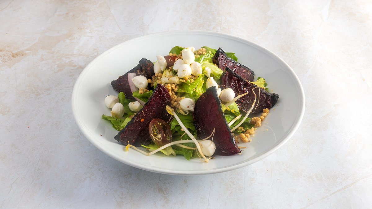 מיקס עלים, בצל סגול, סלק קלוי, גבינת מוצרלה ואגוזי מלך, ברוטב ויניגרט הדרים