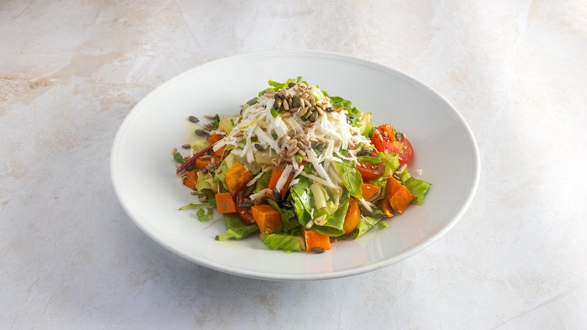 מיקס חסות, מלפפון, בצל ירוק, נבטים, עגבניות שרי, תערובת פיצוחים, קוביות בטטה וגבינה בולגרית מגורדת, ברוטב ויניגרט איטלקי