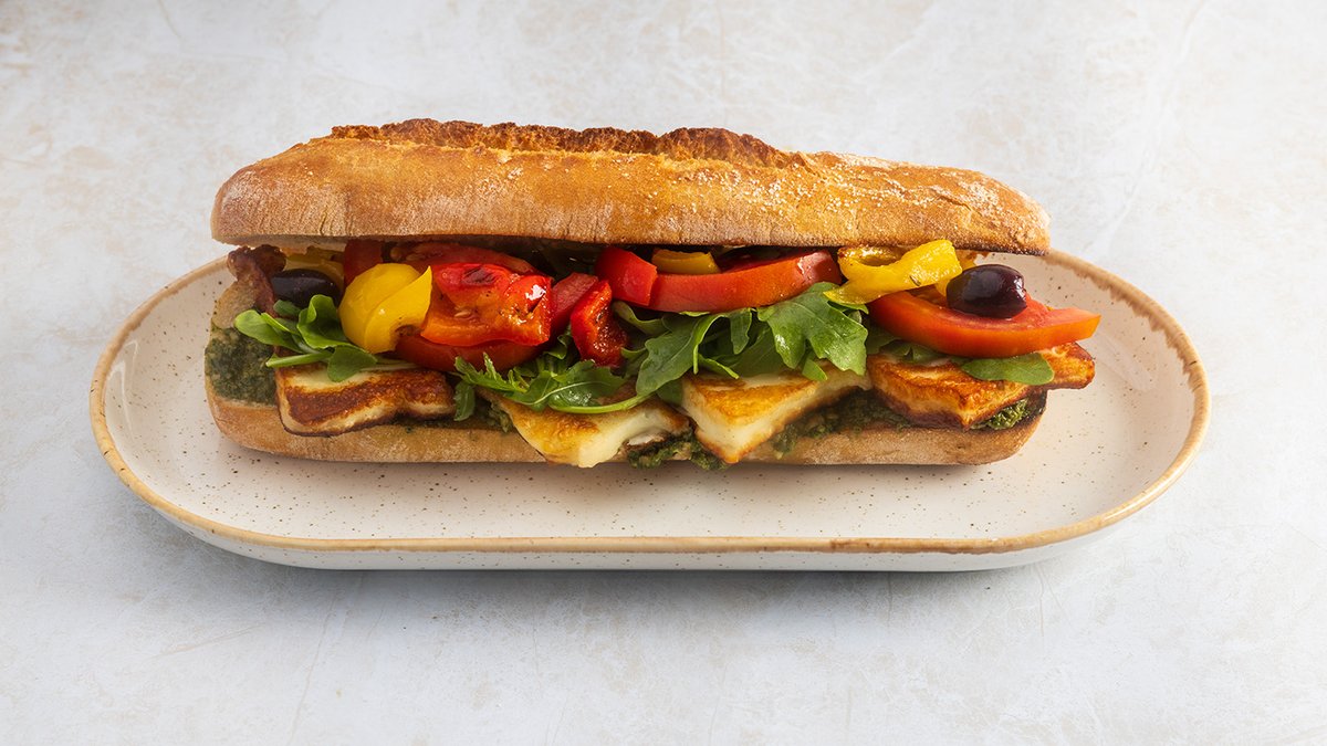 גבינת חלומי, פסטו, עגבניות, זיתים שחורים, מיקס עלים ופלפלים קלויים