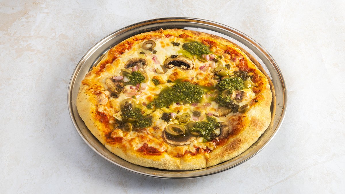 רוטב עגבניות, פטריות שמפניון, בצל סגול, פסטו, זיתים, גבינת מוצרלה וצהובה