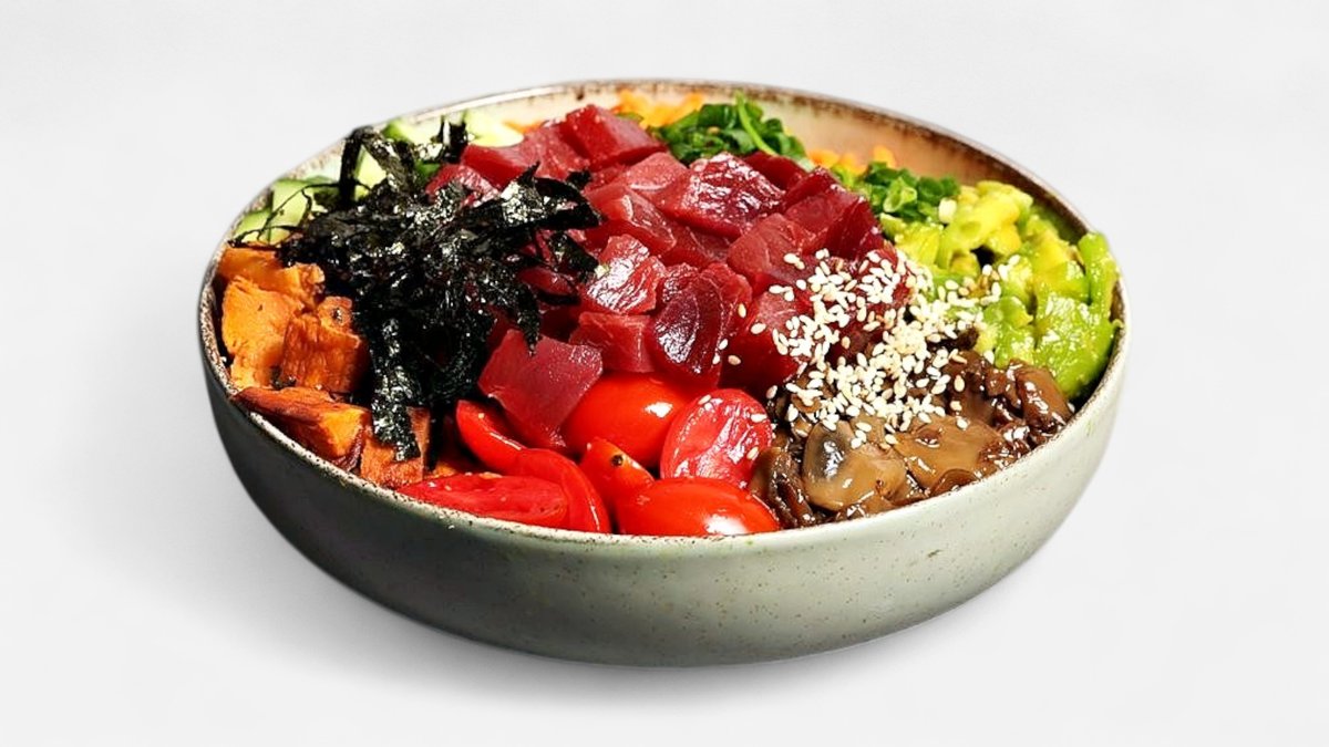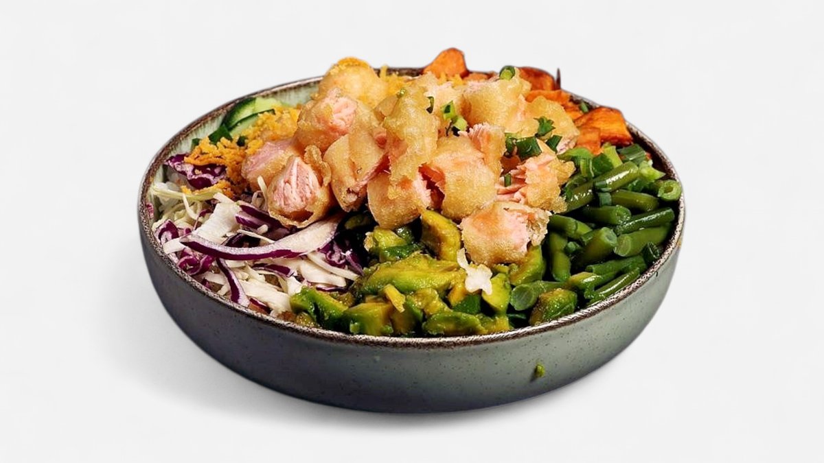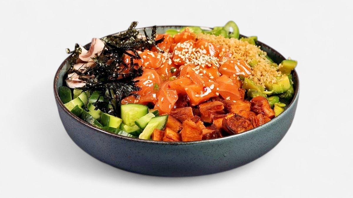 קערת אורז, מלפפון, אבוקדו, גזר, בטטה, פטריות ובצל ירוק עם תוספת דג לבחירתך עם תוספת קרנץ מעל