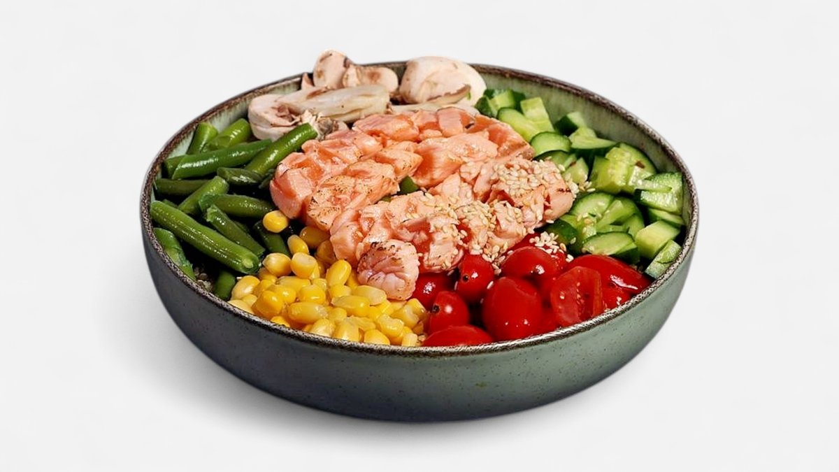 אורז חום, מלפפון, גזר, שעועית ירוקה, פטריות חי, בצל ירוק, תירס, סלמון צרוב, אצות ושומשום מעל, עם שמן זית לימון, רוטב שום וסויה