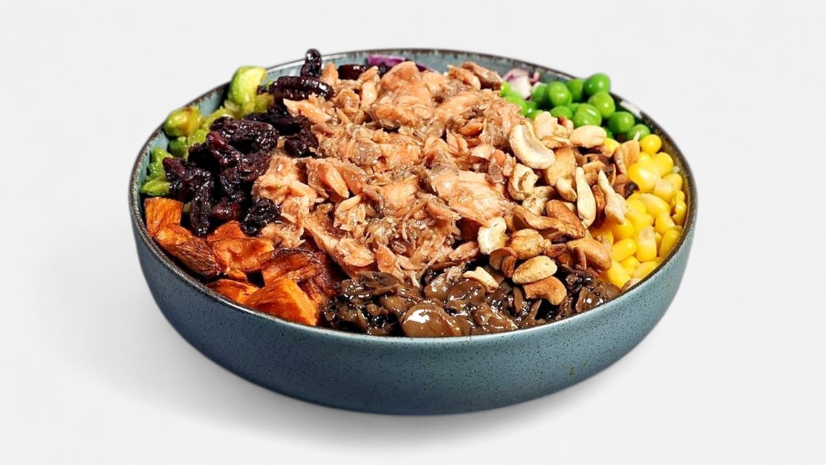 אורז לבן, אבוקדו, בטטה, כרוב מיקס, פטריות טריאקי, תירס ואפונה סלמון אפוי, פקאן וקשיו מעל, עם טריאקי, ספייסי מיו ורוטב הבית