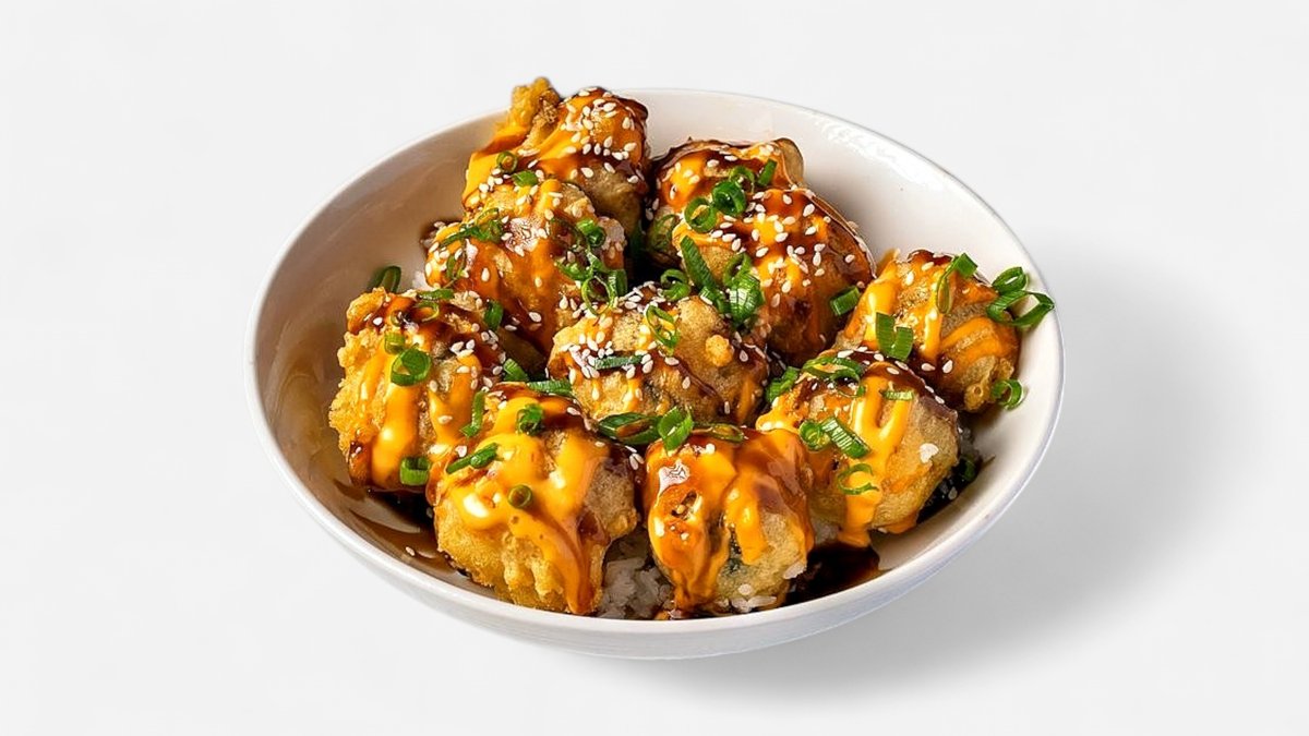 10 יח' של בטטה ואורז מטוגן בטמפורה, מוגש על מנת אורז, רוטב ספייסי מיו וטריאקי, בצל ירוק ושומשום