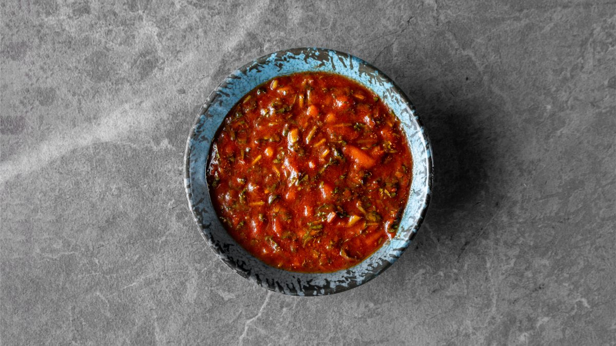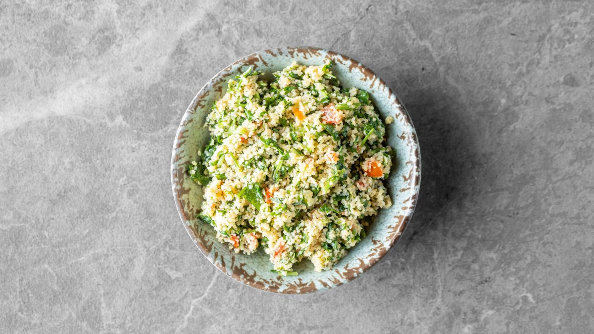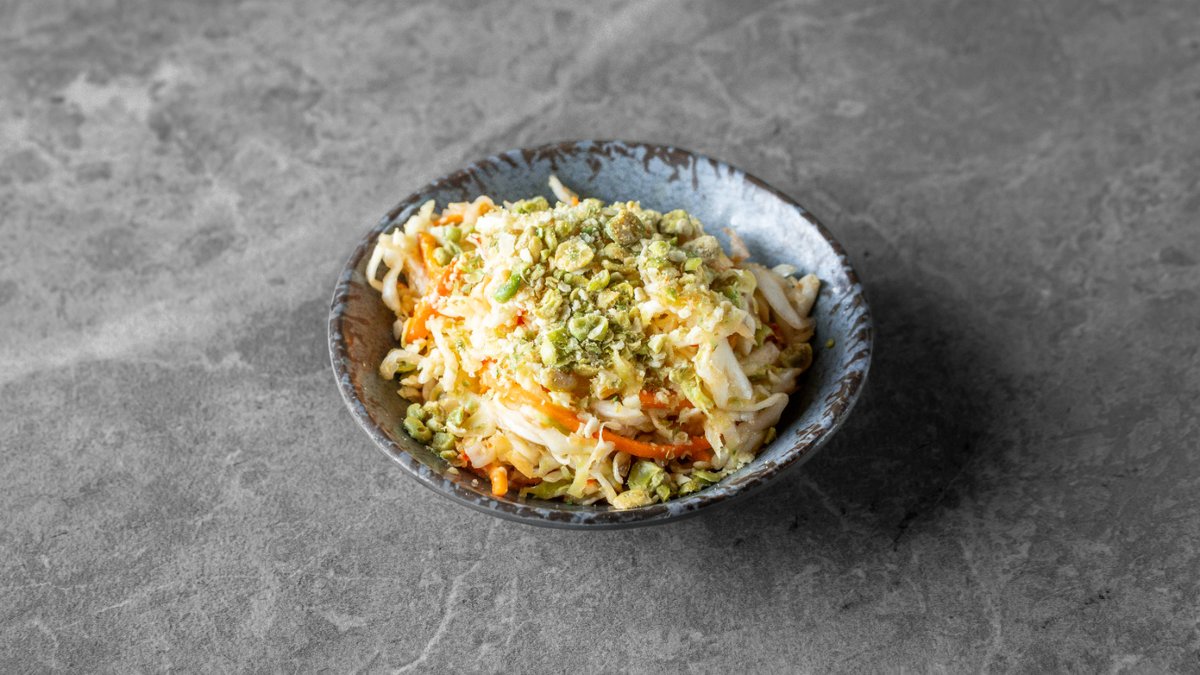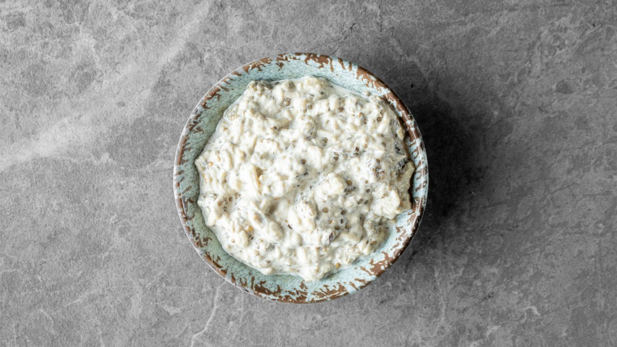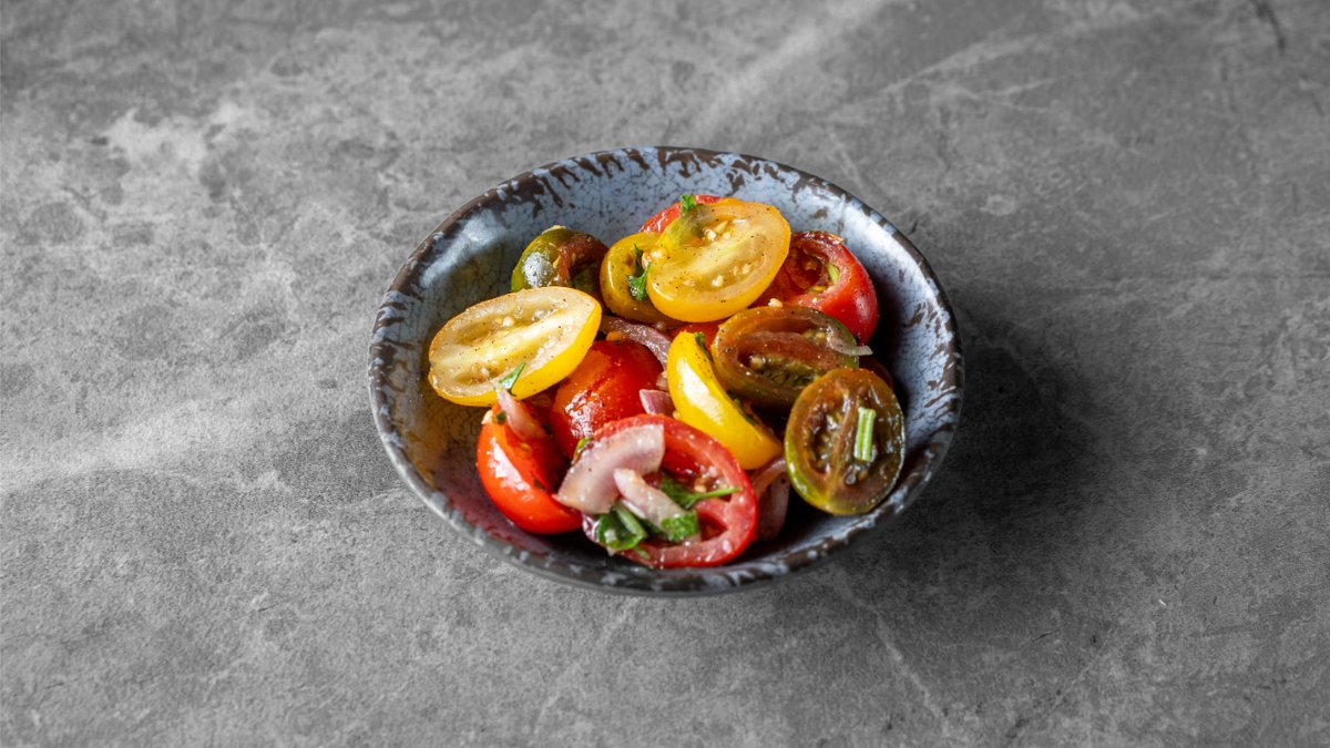 מלפפון, עגבניה, בצל סגול ונענע קצוצים מוגש עם טחינה