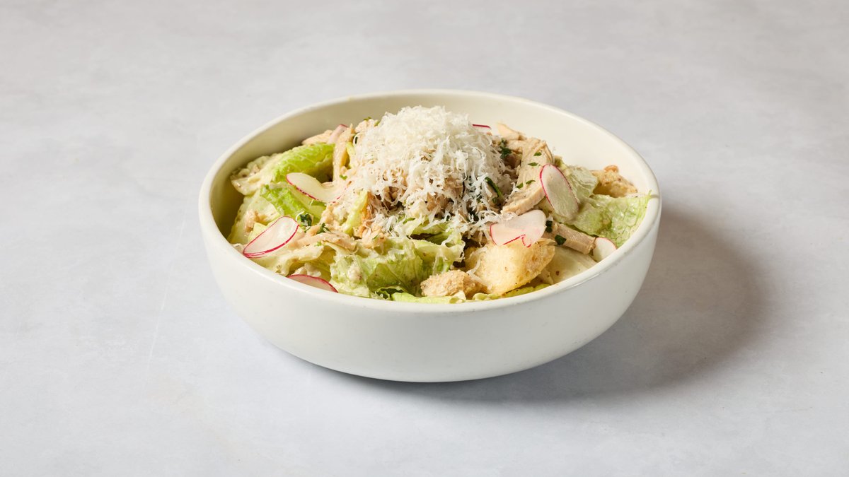 לבבות חסה, חזה עוף, מפורק, צנונית, פרמז'ן, קרוטונים, איולי קיסר.