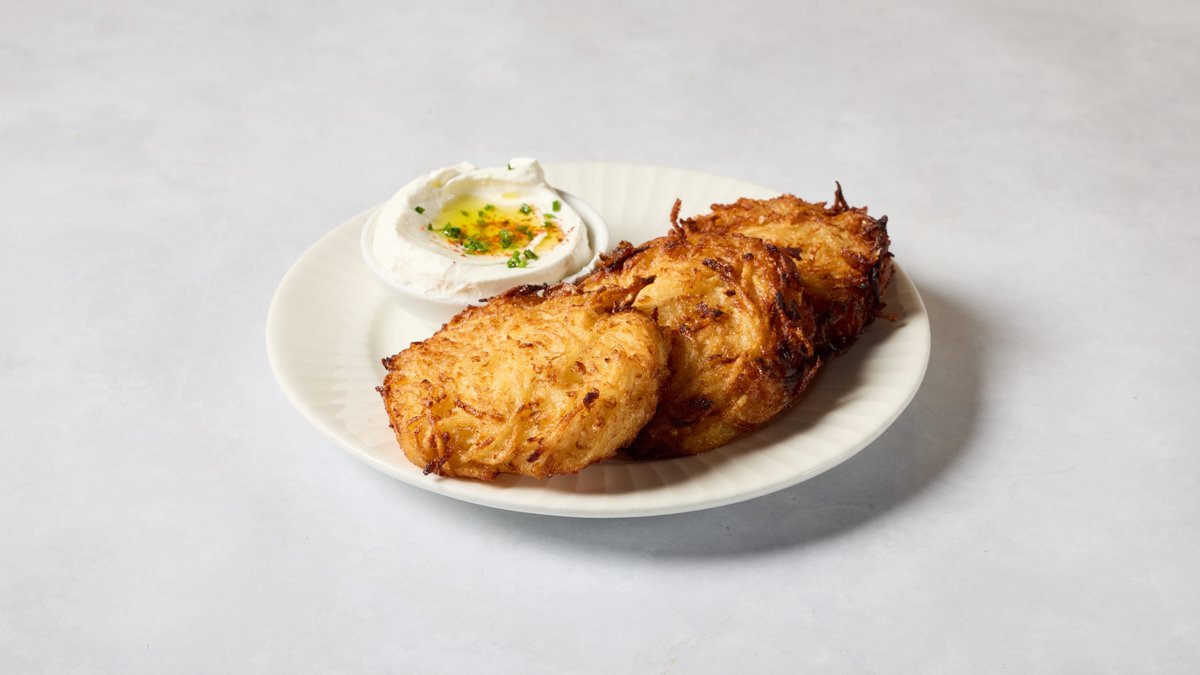 לביבות תפוחי אדמה, קרם פרש ועירית לצד סלט עלים בוינגרט הדרים ואגוזים.