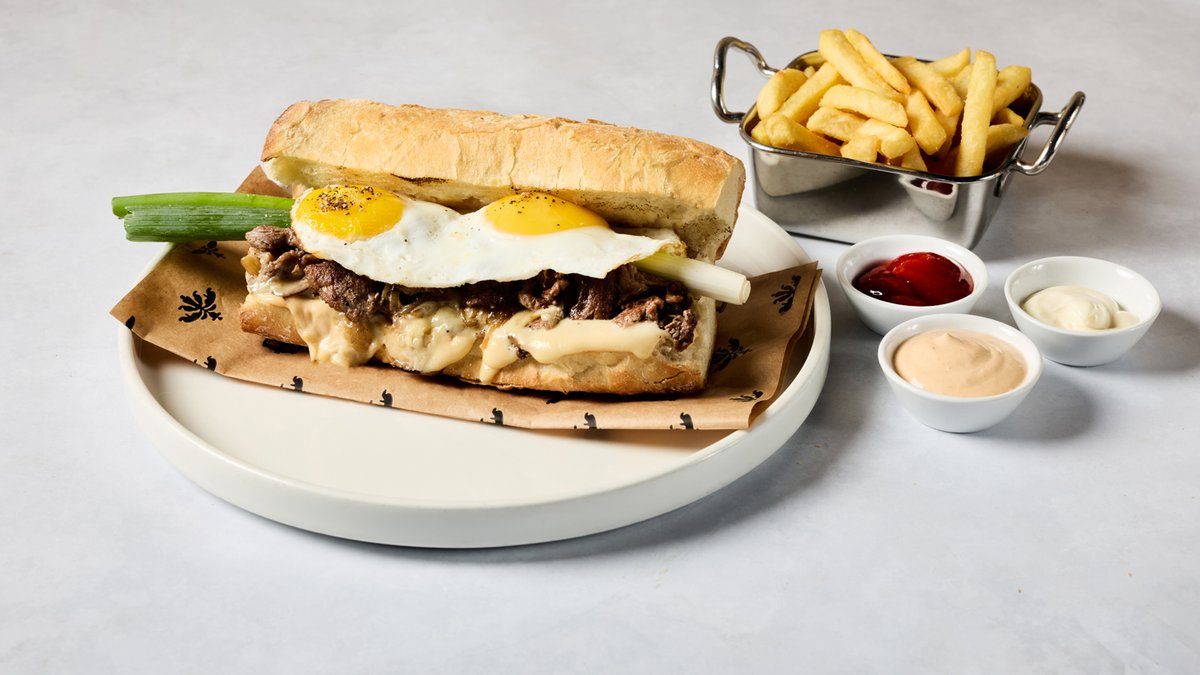 הסטייק & אגז סנדוויץ' המפורסם מפילדלפיה | ג'בטה מהמאפייה שלנו עם נתחי אנטריקוט עסיסי צרובים במחבת עם בצל, פטריות, גבינת גאודה, איולי צ׳יפוטלה ושתי ביצי עין עשויות טוב מוגש עם צ'יפס