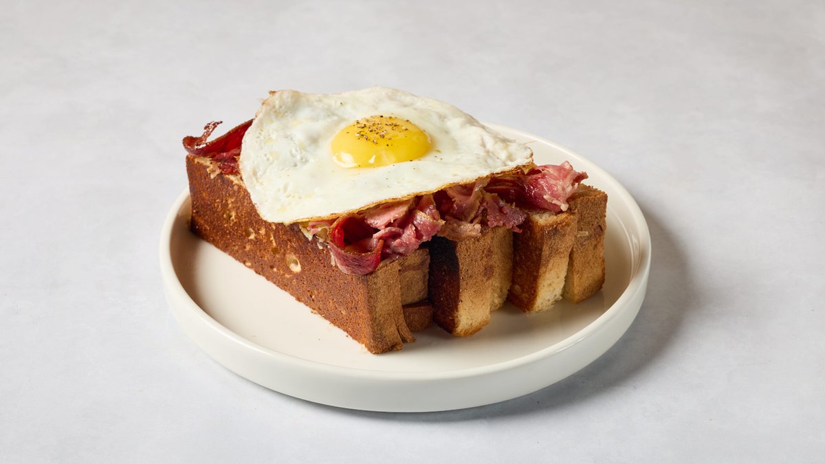 טוסט בריוש, קורנדביף, בשמל,גבינת גאודה, עגבנייה, ביצת עין וסלט עלים בוינגרט הדרים ואגוזים.