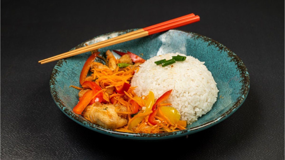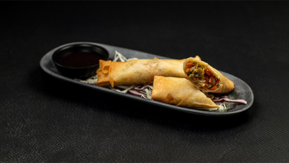 2 רולים פריכים במילוי ירקות מוקפצים, מוגש עם רוטב חמוץ מתוק