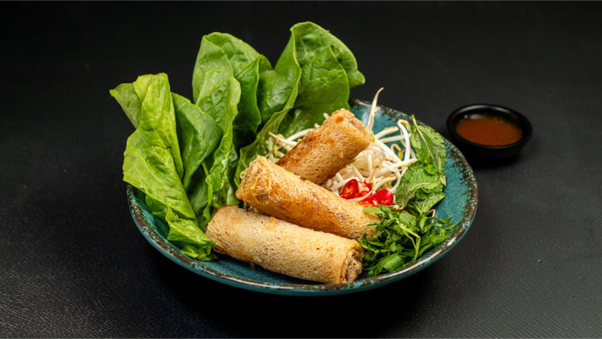 3 רולים מטוגנים, במילוי פרגית, ירקות ותבלינים, מוגש עם רוטב צ׳ילי נענע