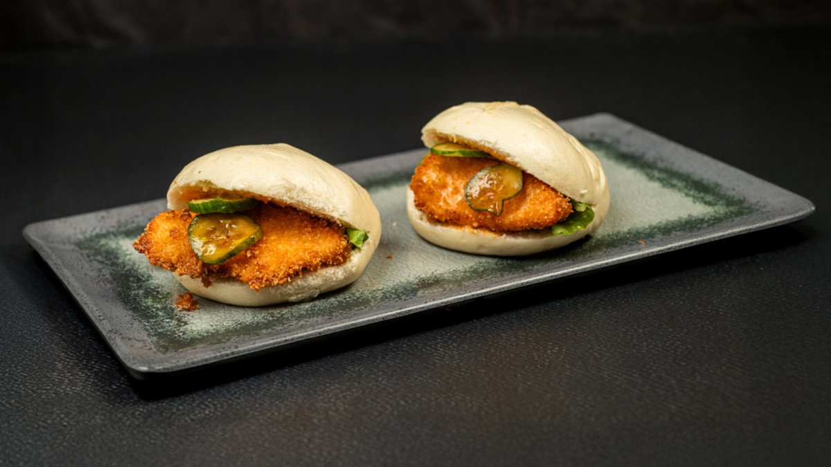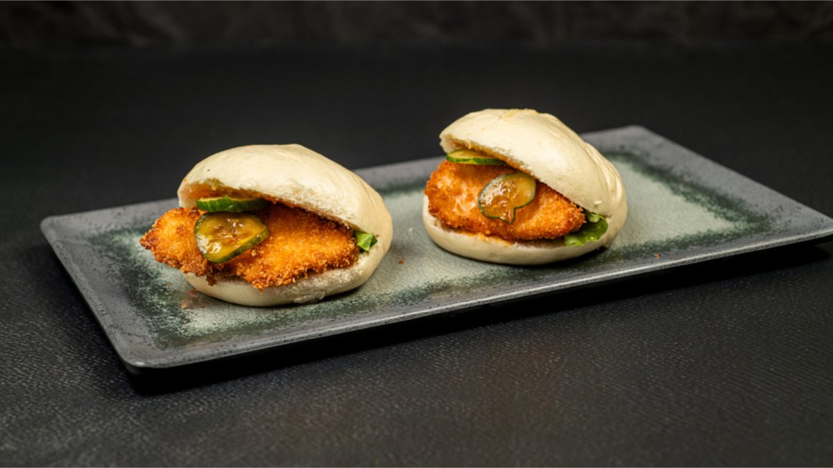 2 לחמניות באן מאודות במילוי סלמון טמפורה, חסה, מלפפון כבוש ורוטב ספייסי מיונז