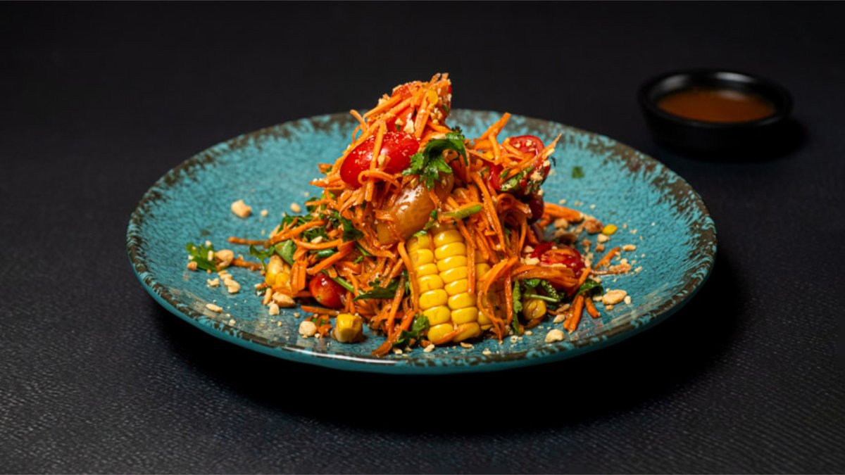 סלט תאילנדי קלאסי עם פאפיה, עגבניות שרי, נענע, שום, צ׳ילי טרי, גזר כוסברה ובוטנים ברוטב חמוץ-מתוק חריף, מרענן ופיקנטי