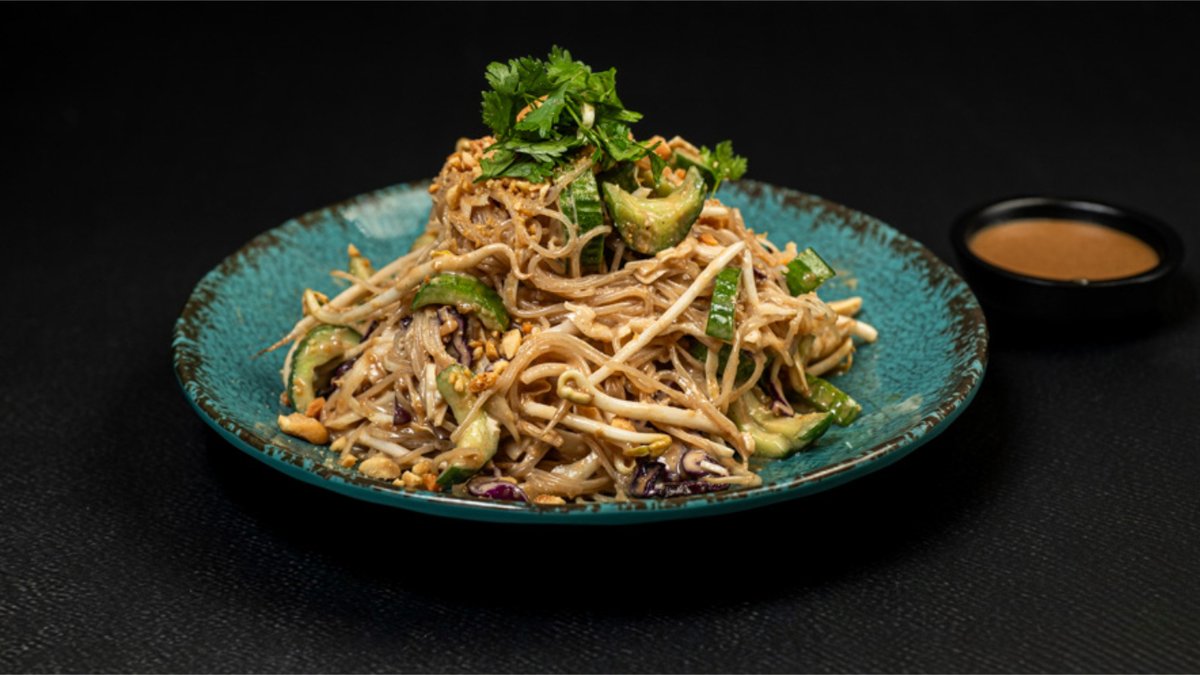 סלט אטריות שעועית עם מלפפון, כרוב סגול כרוב לבן ונבטים, מתובל עם רוטב חמאת בוטנים