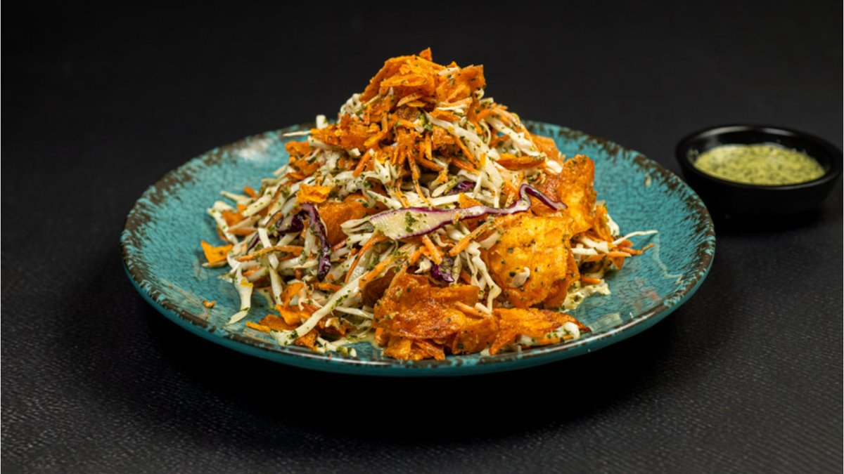סלט עשיר ומרענן עם כרוב לבן כרוב סגול, גזר וקריספי בטטה, מתובל ברוטב איולי נענע קרמי