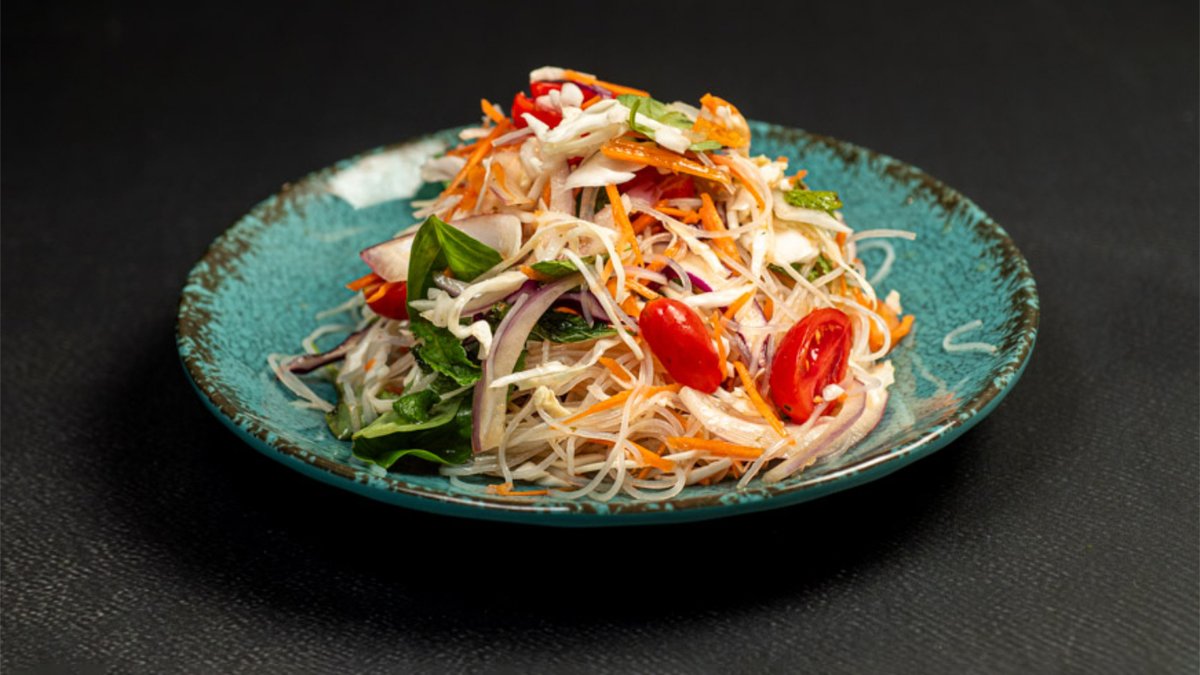 סלט טרי וצבעוני עם כרוב לבן, כרוב סגול, אטריות שעועית, גזר, עגבניות שרי ובצל סגול, מעושר בנענע ובזיליקום טריים עם נגיעות צ׳ילי חריף, ברוטב נענע צ׳ילי