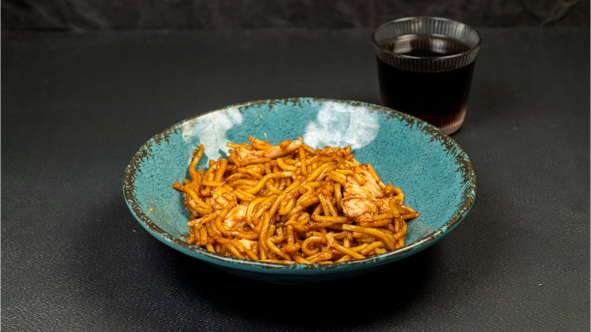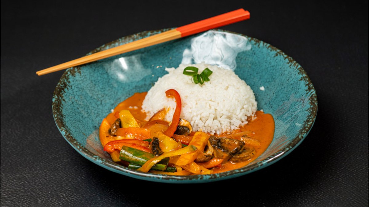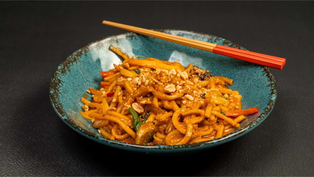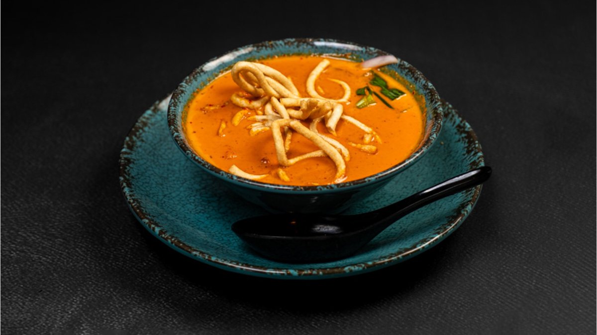 מרק קארי תאילנדי קטיפתי על בסיס קארי אדום וחלב קוקוס, מוגש עם אטריות אודון רכות, אטריות אודון קריספיות, בצל סגול, בצל ירוק וכוסברה טרייה