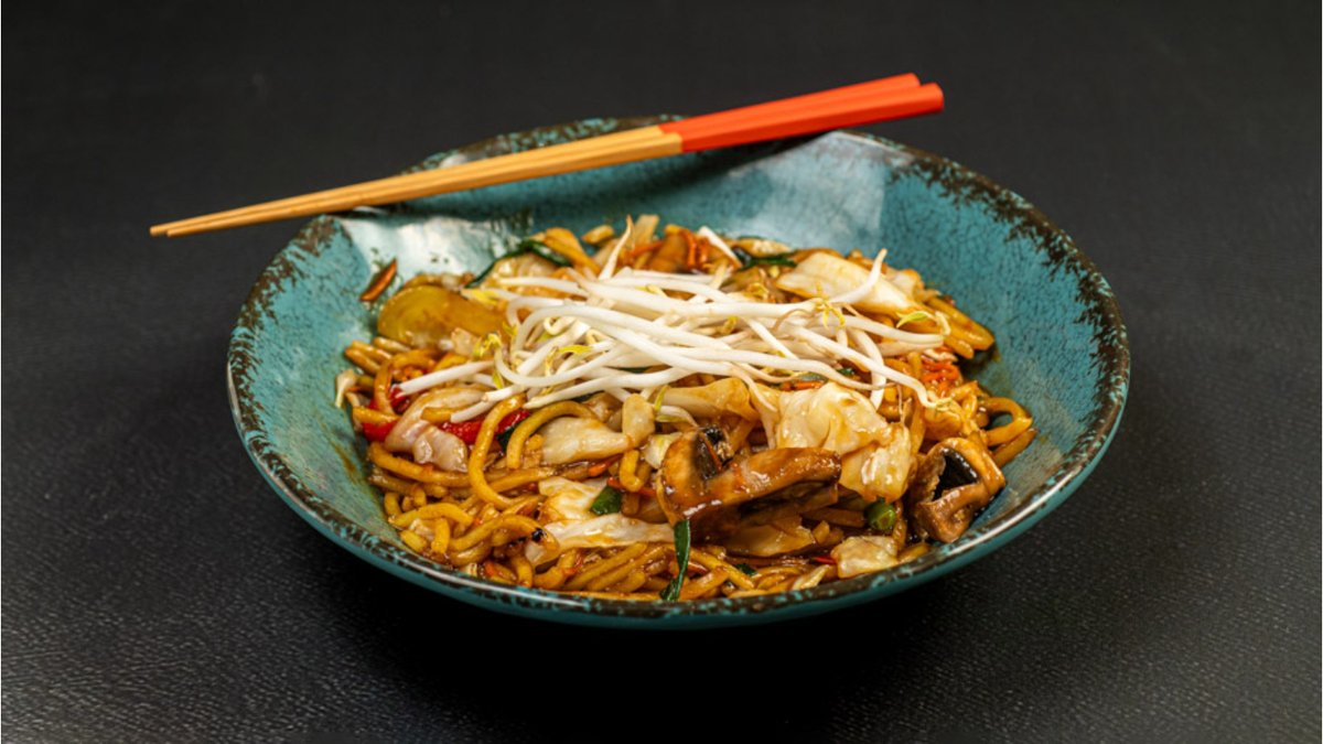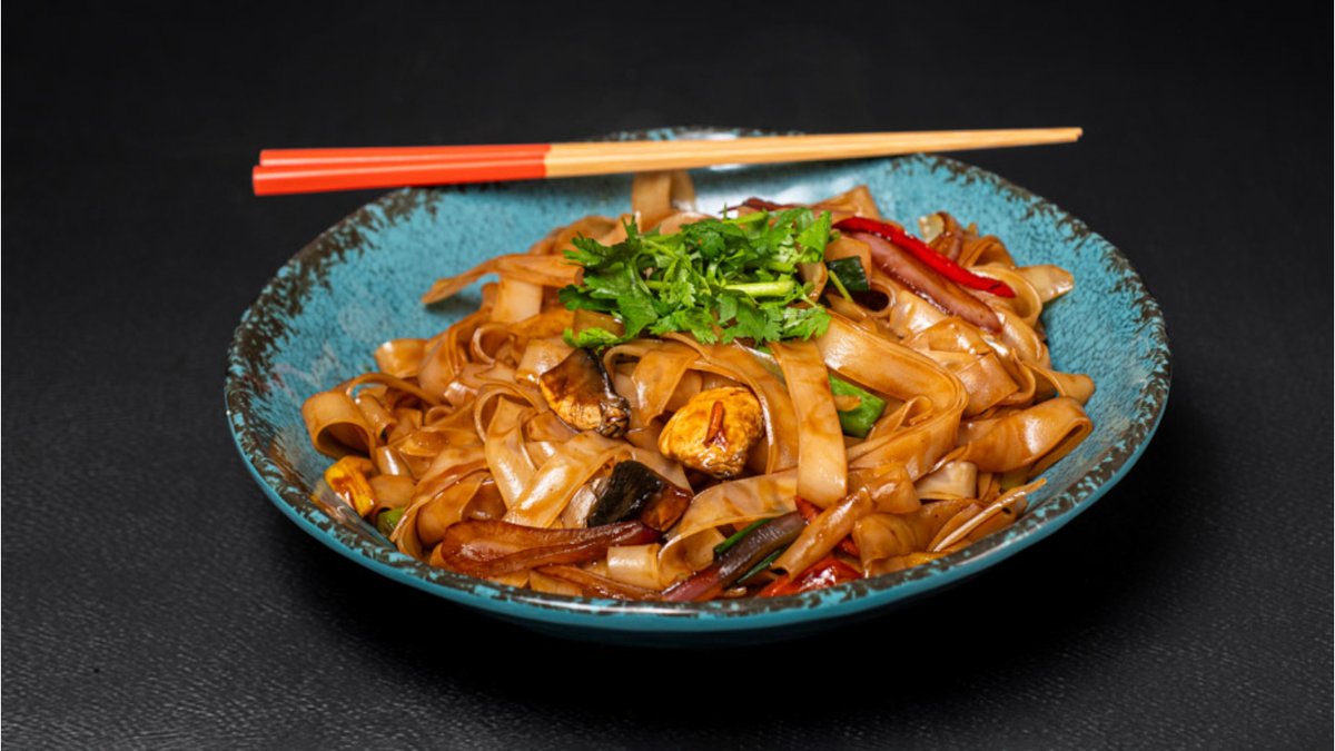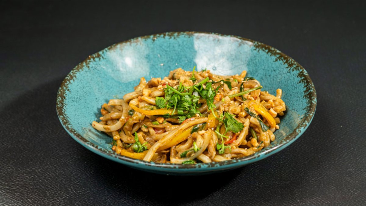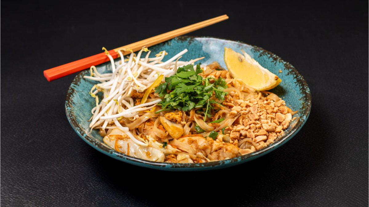 אטריות אורז מוקפצות ברוטב פאד תאי אותנטי עם נטיפי ביצה, כרוב לבן, גזר ובצל ירוק וקישוט של נבטים פלח לימון כוסברה ובוטנים מכיל גלוטן