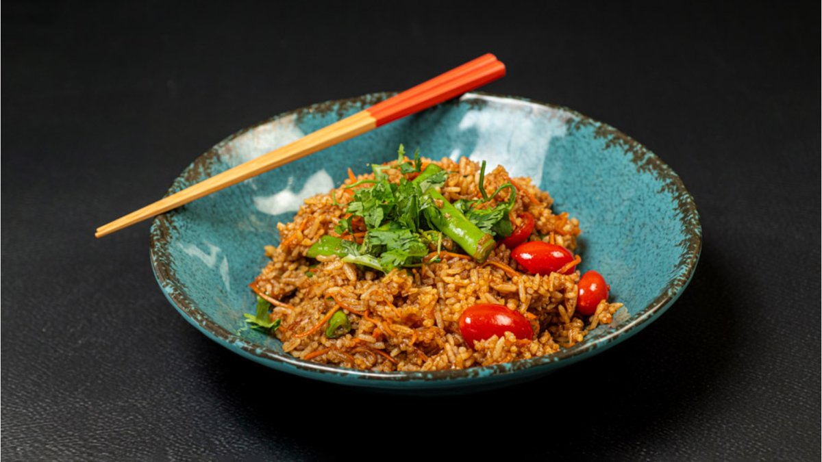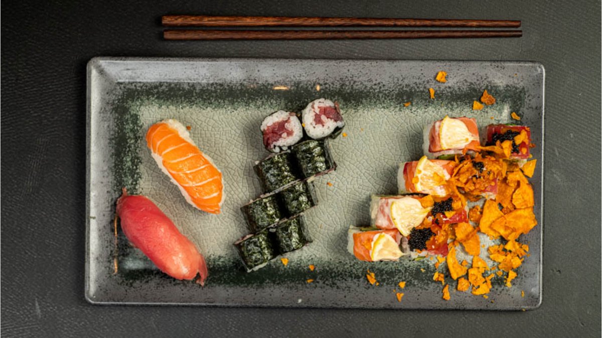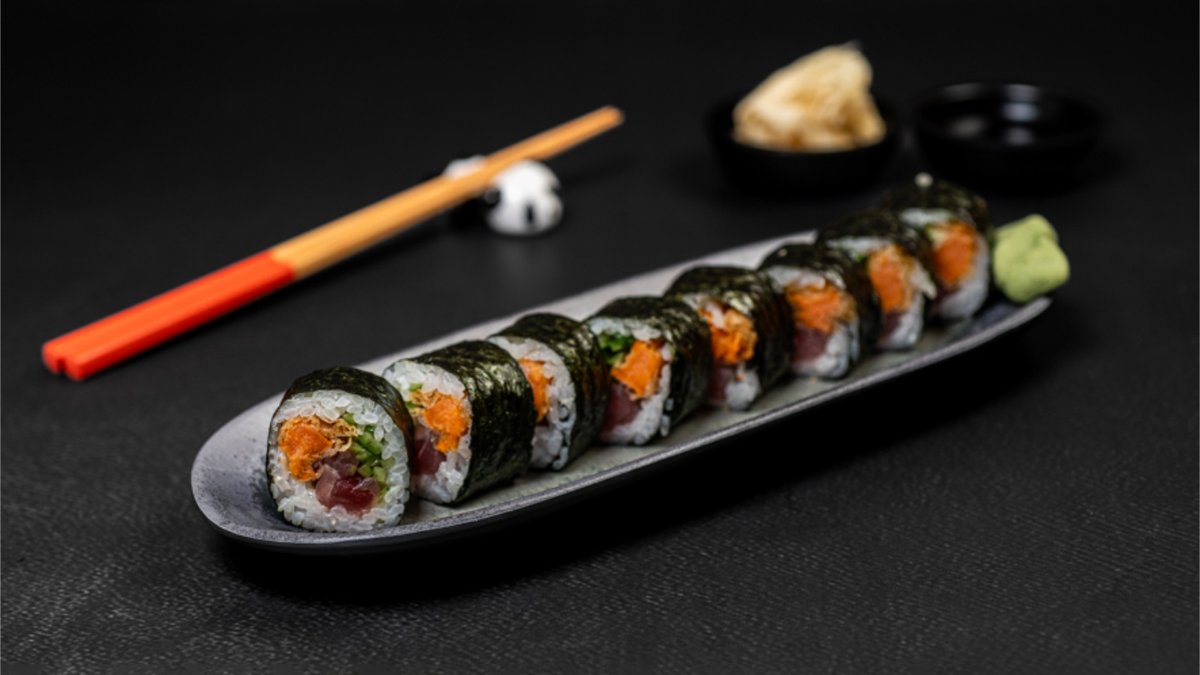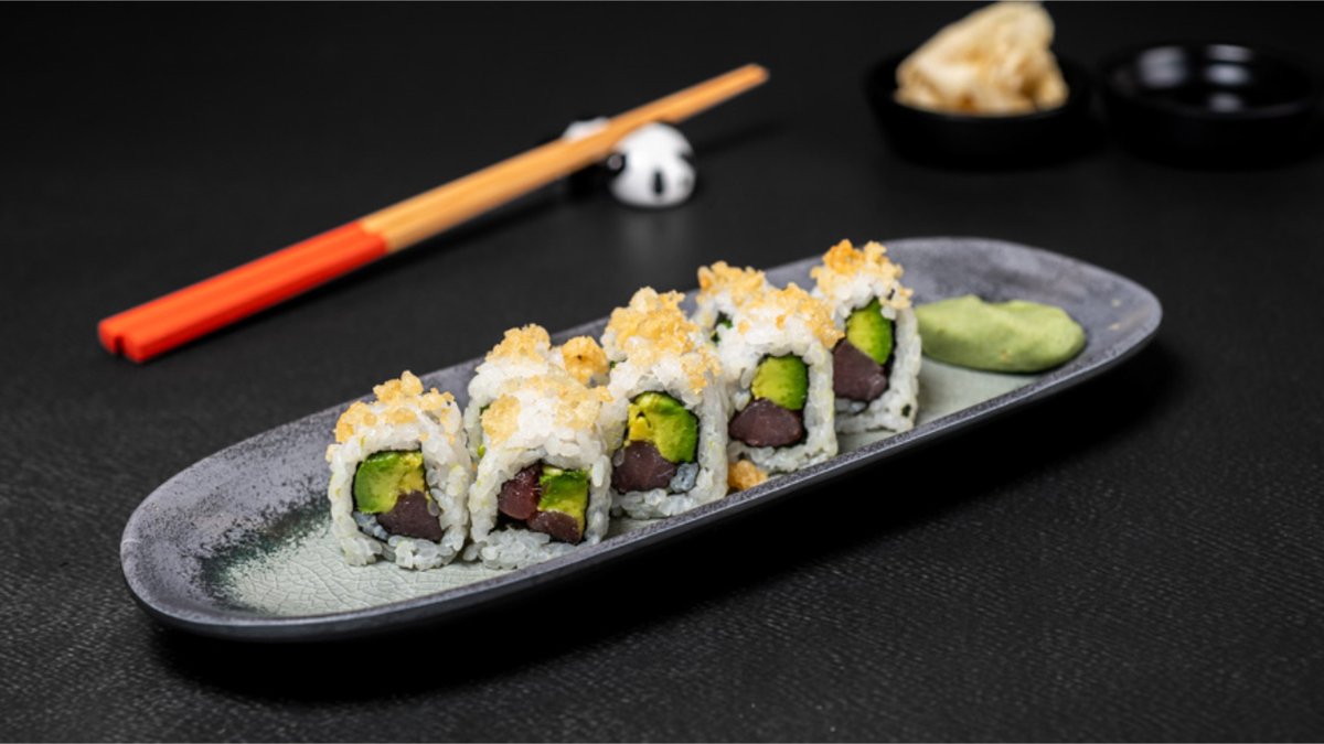 רול סושי במילוי בטטה, בצל ירוק ואבוקדו, עם תערובת סביצ׳ה מרעננת של טונה סלמון ונענע, מוגש עם רוטב טריאקי, תיבול טוגראשי ושערות קדאיף קראנציות