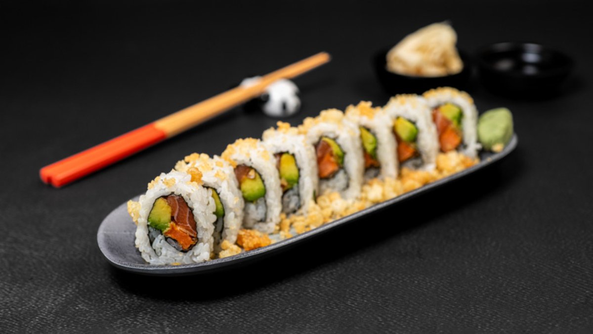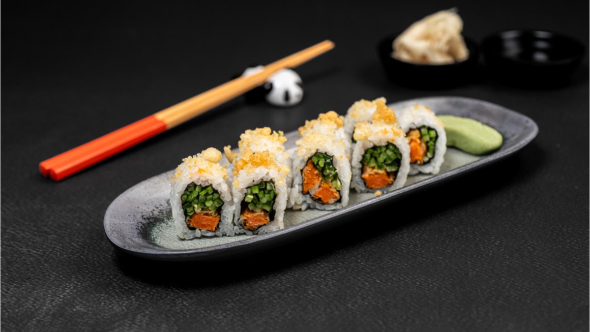 רול סושי בציפוי פריך וזהוב דג ו2 ירקות לבחירה