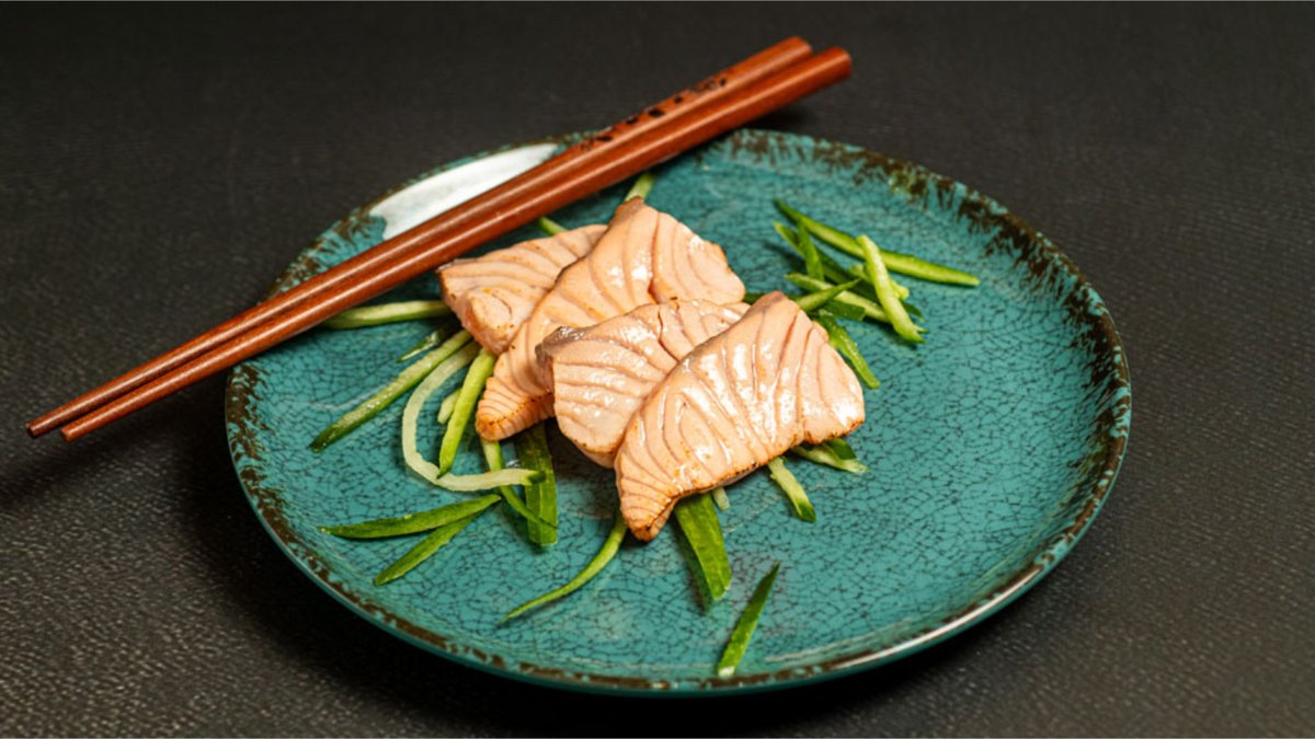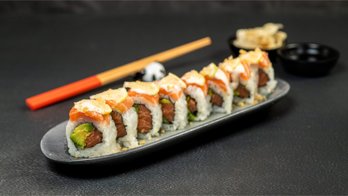 רול מרענן במילוי סלמון, אבוקדו, שבבי טמפורה, ובצל ירוק עטוף בסלמון נא, עם מיונז יוזו ופרוסות לימון