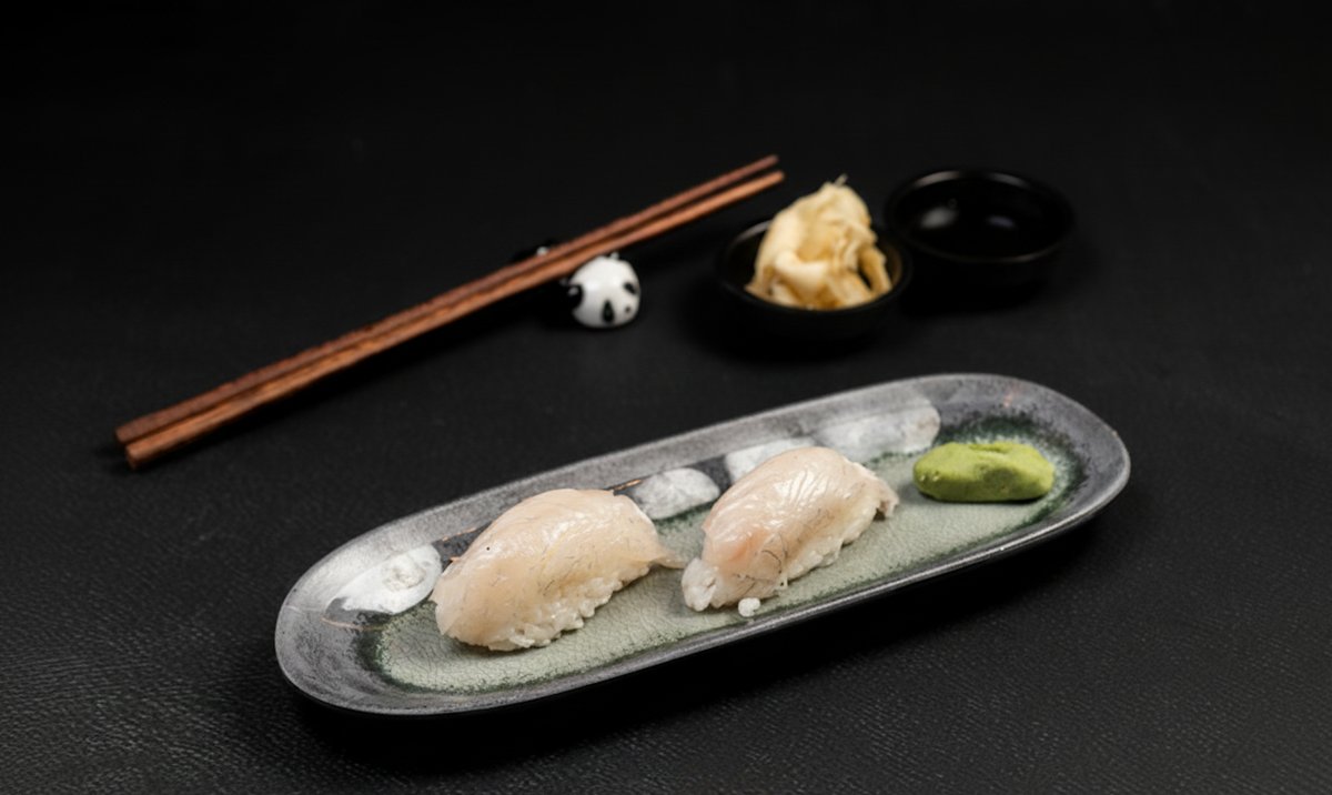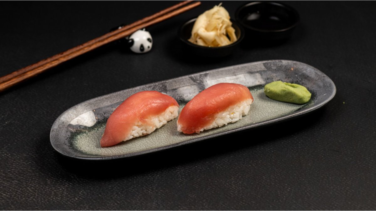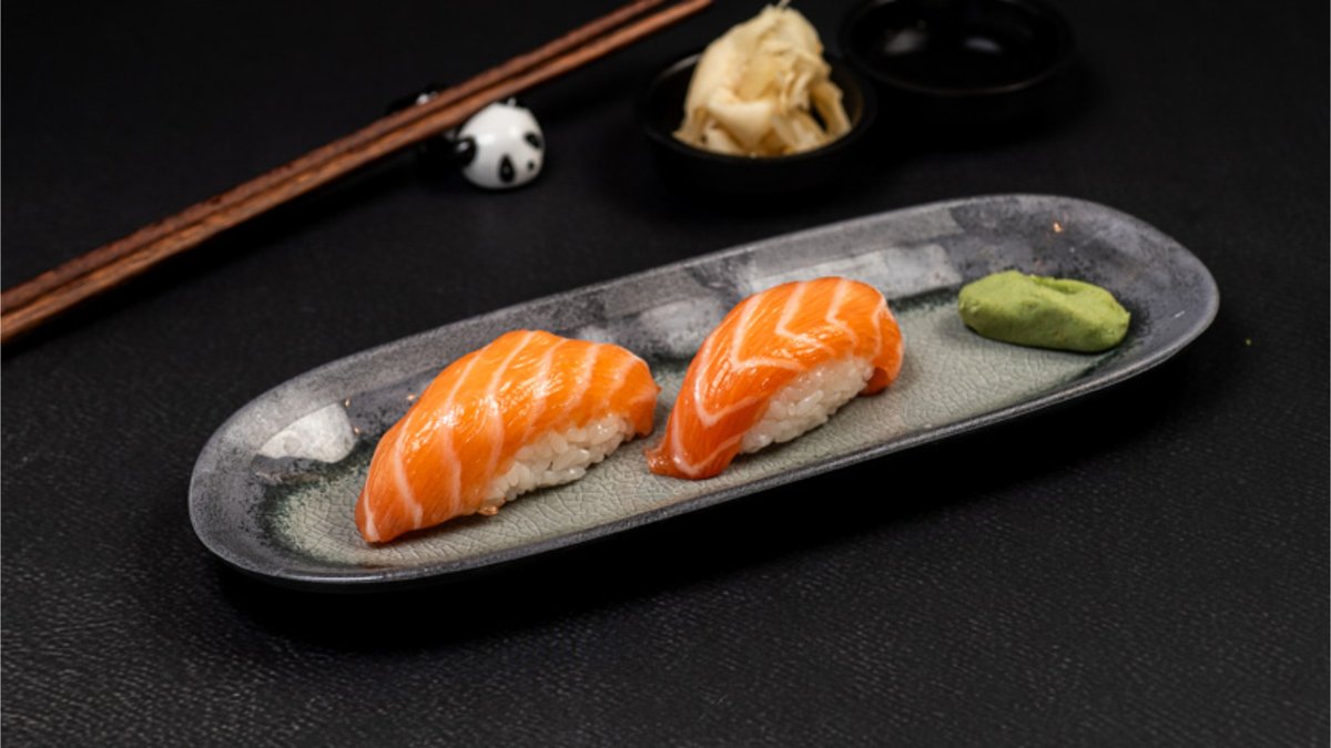 זוג אצבעות אורז עטופים של סלמון, טונה, דג לבן
