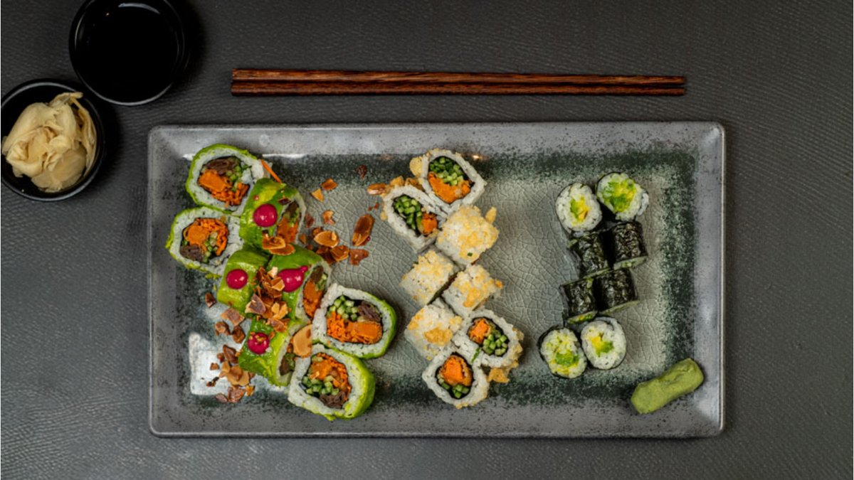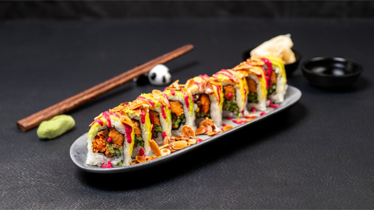 רול צמחוני מרענן במילוי קנפיו בטטה בטמפורה טמאגו ומלפפון. עטוף באבוקדו ורוטב איולי סלק עם נגיעות שקדים פריכים