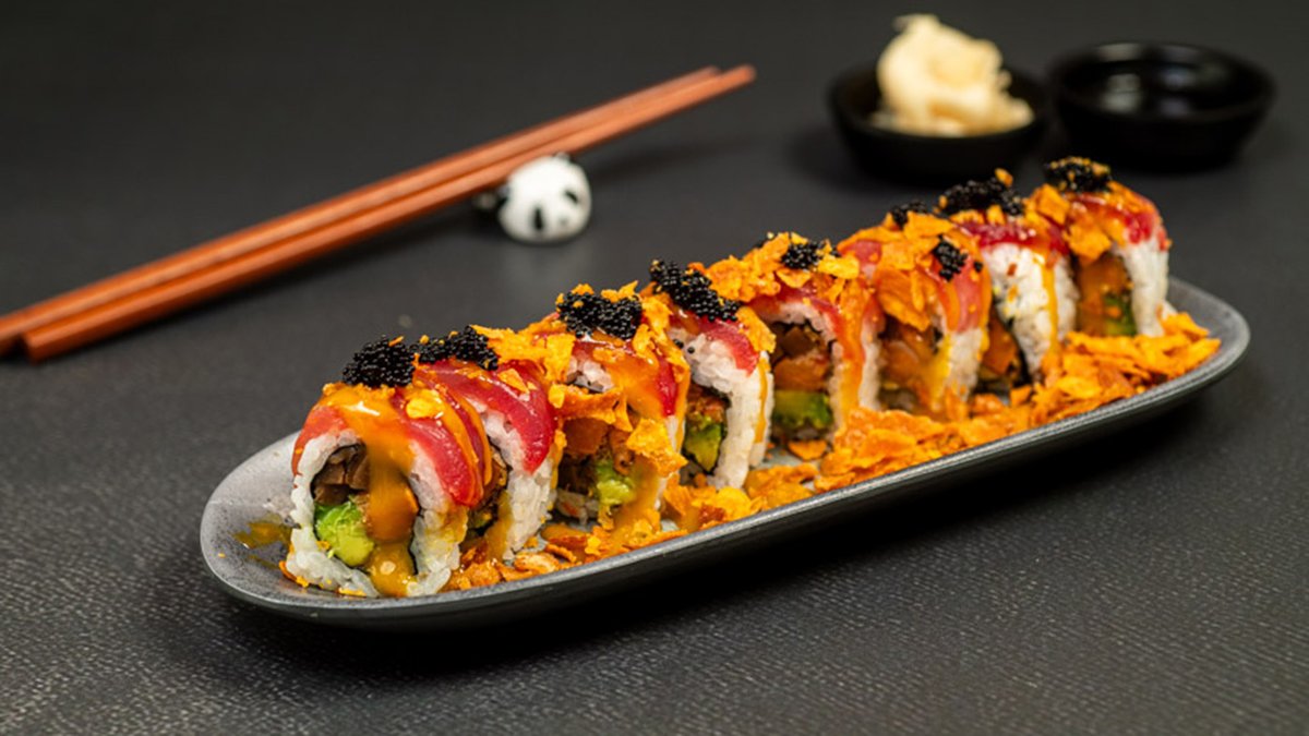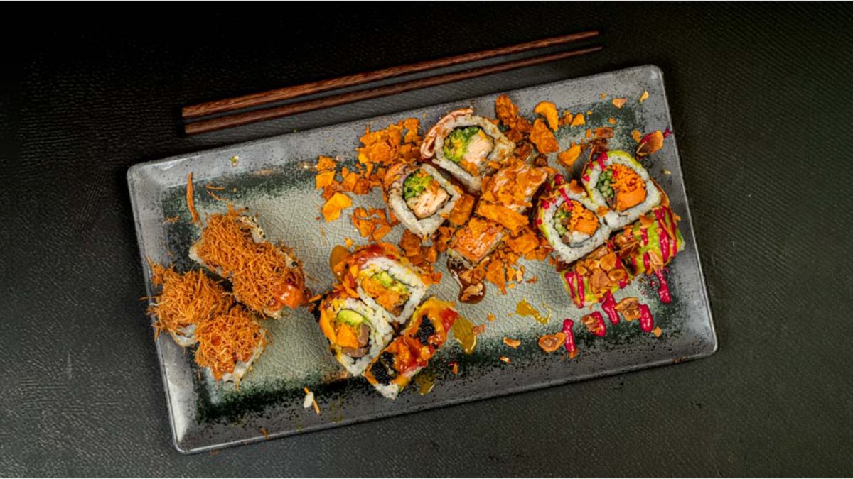רול עשיר במילוי בטטה טמפורה, אבוקדו ופטריות שיטאקי. עטוף בטונה אדומה, טוביקו שחור עם איולי מנגו ומתקתק וקריספי בטטה.