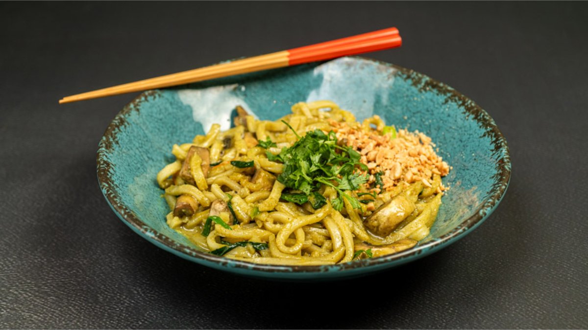 מרק קארי תאילנדי קטיפתי על בסיס קארי אדום וחלב קוקוס, מוגש עם אטריות אודון רכות, אטריות אודון קריספיות, בצל סגול בצל ירוק וכוסברה טרייה