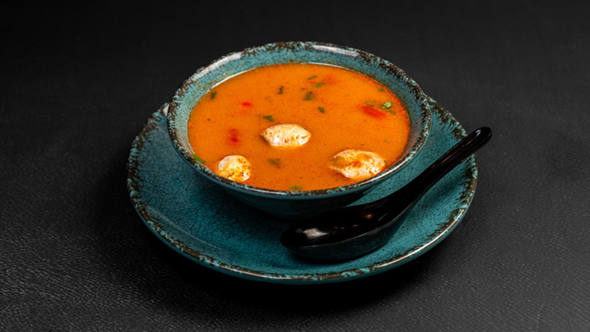 מרק תאילנדי חמוץ חריף, קרם קוקוס, צ׳ילי, ליים, עגבניות שרי, אטריות שעועית, פטריות וכוסברה