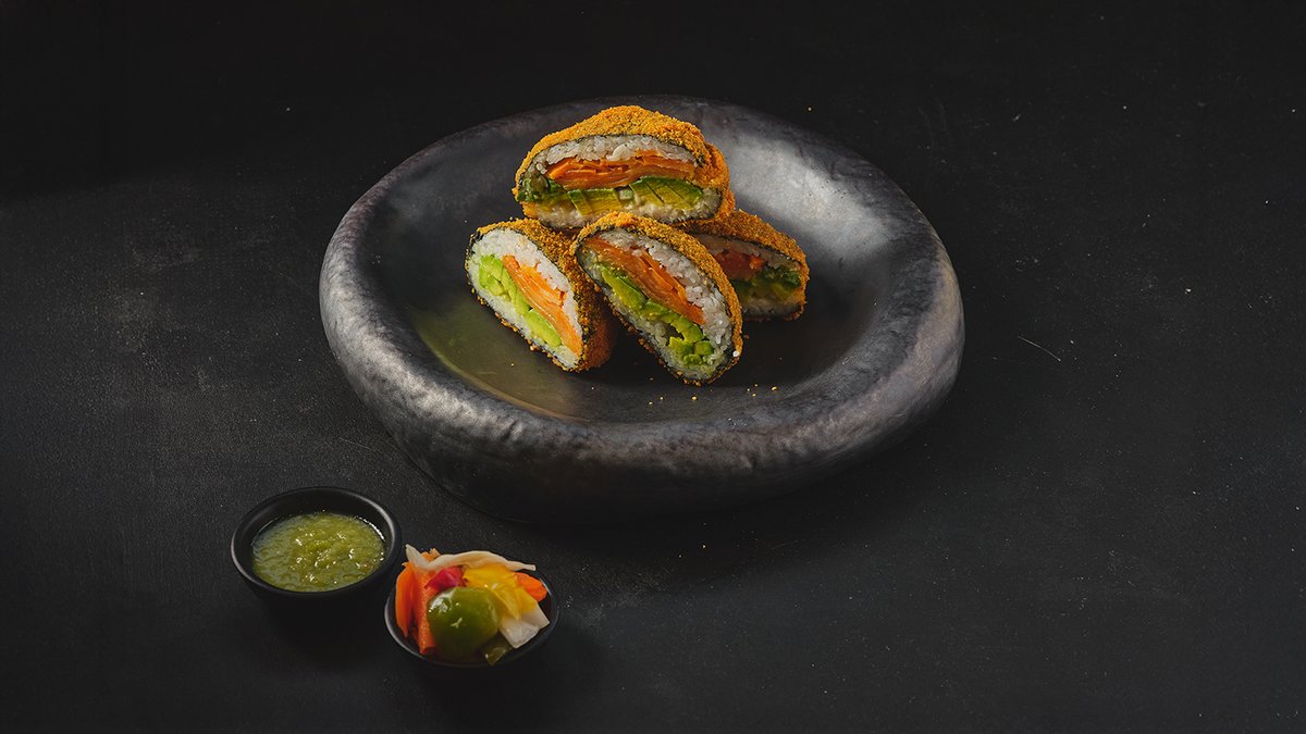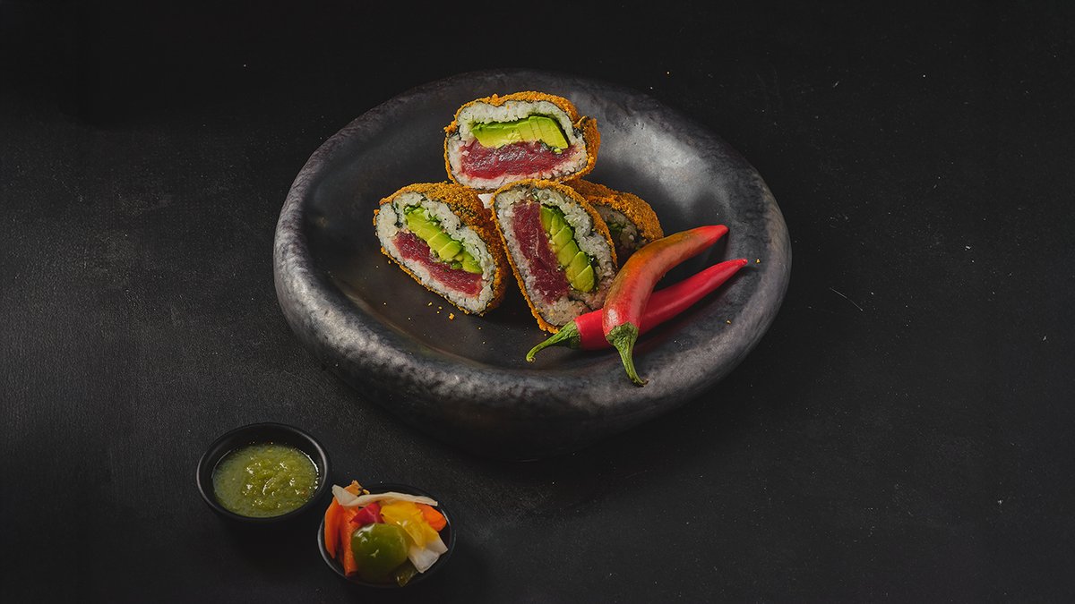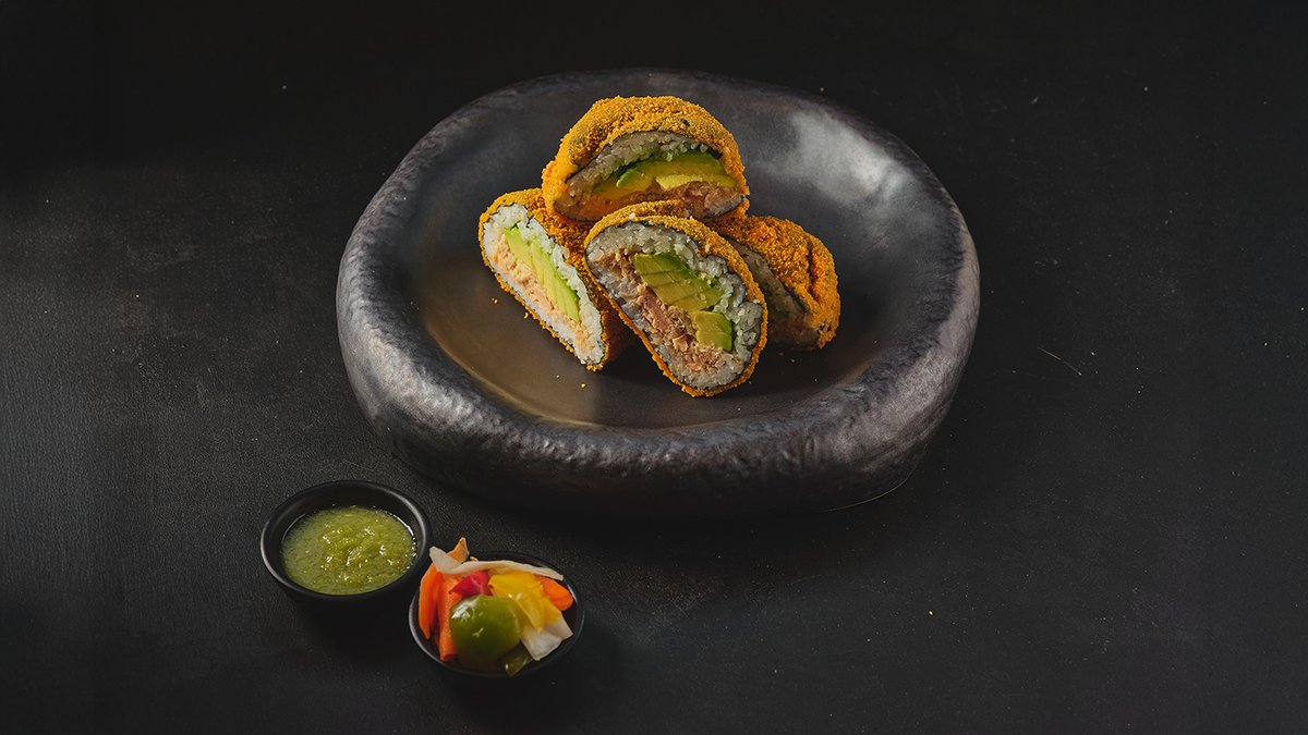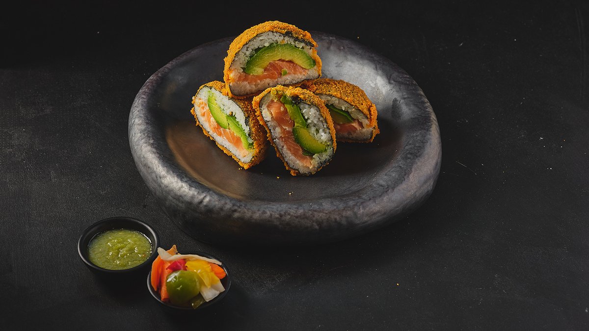 רול מטוגן במילוי סלמון, בטטה אבוקדו ובצל ירוק בציפוי טמפורה ופנקו